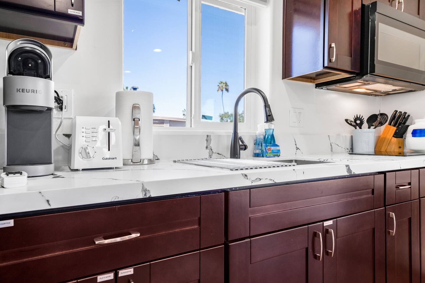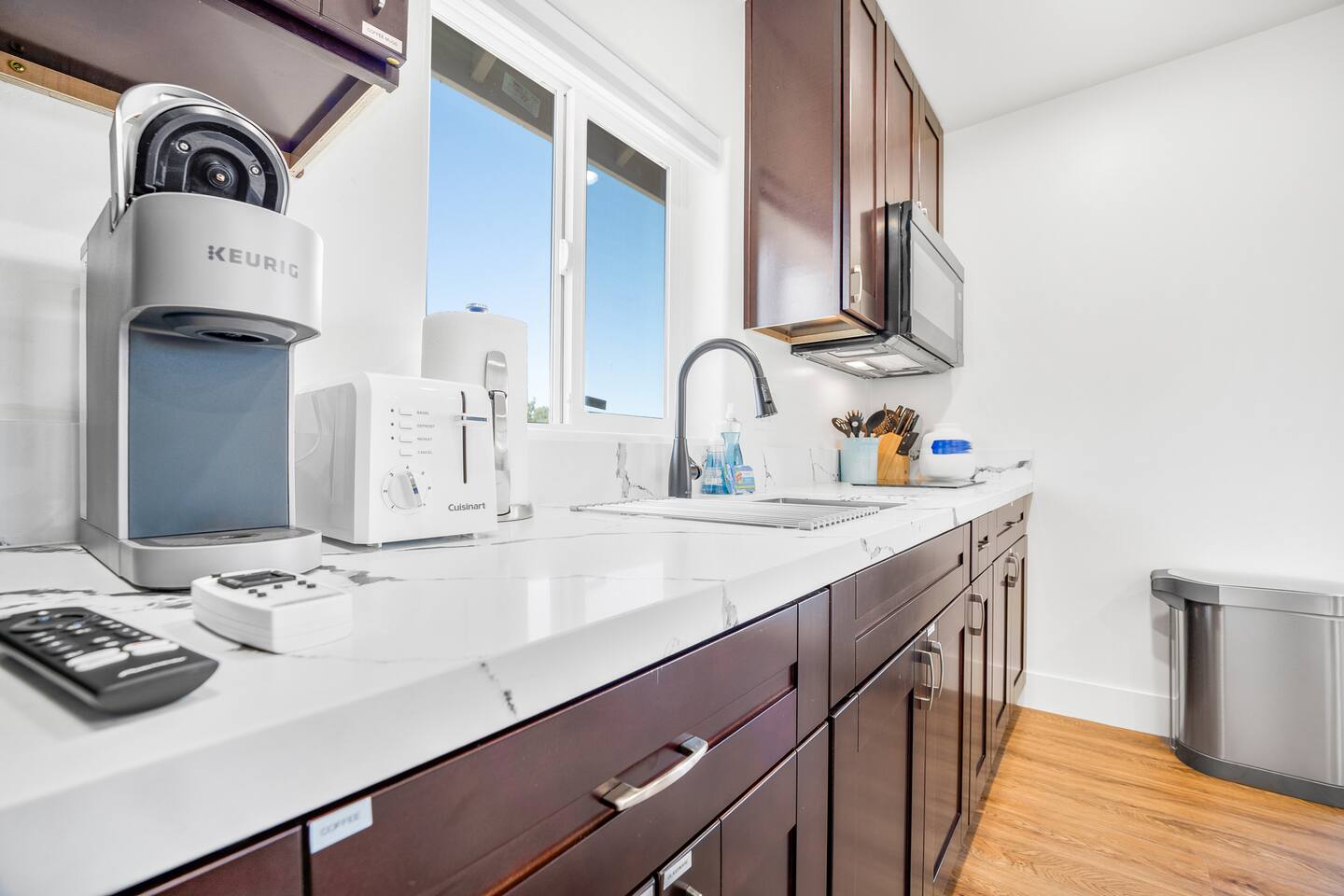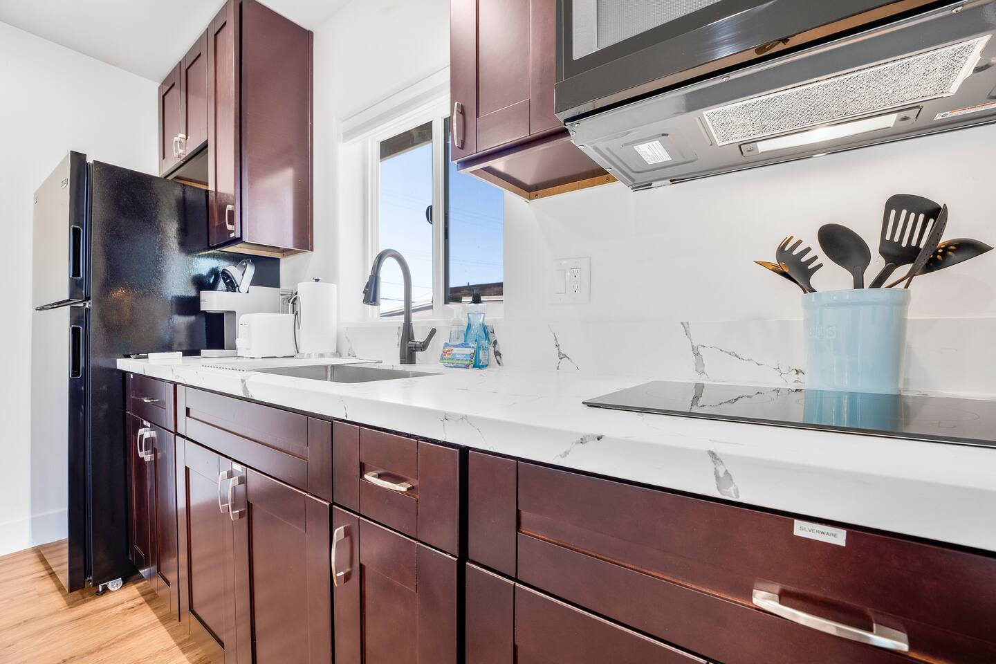 A gorgeous space to unwind and relax. Beautifully decorated with new designer furniture throughout. Extra comfy new beds with high end linens. Space sleeps up to 6 people. Enjoy sunsets from our patio. Our open plan living area with resort style couches, outdoor dining with BBQ grill for a wonderful dining experience. The open plan layout and large windows provide an abundance of natural light. Living Area: Luxury futon sofa(sleeps one person) with 55 inch Smart T.V and central AC Bedroom 1: King Bed with luxury linens. Central AC Bunk room with central AC: Bunk bed#1 Bottom bunk: Full size mattress Top bunk: Twin size mattress Bunk bed #2 Top bunk: Twin mattress Bottom bunk: Twin mattress Kitchen: Fully stocked kitchen with fridge, microwave, electric stove top(no oven), toaster, and Keurig coffee maker. We provide dish soap, sponge, trash bags, paper towels and coffee k-cups. Bathroom: Full size bath stocked with the following essentials: shampoo, conditioner, body soap and towels. Parking: One parking spot for a mid size SUV Shared Access for the washer & dryer, outdoor shower, and outdoor grill (propane provided).