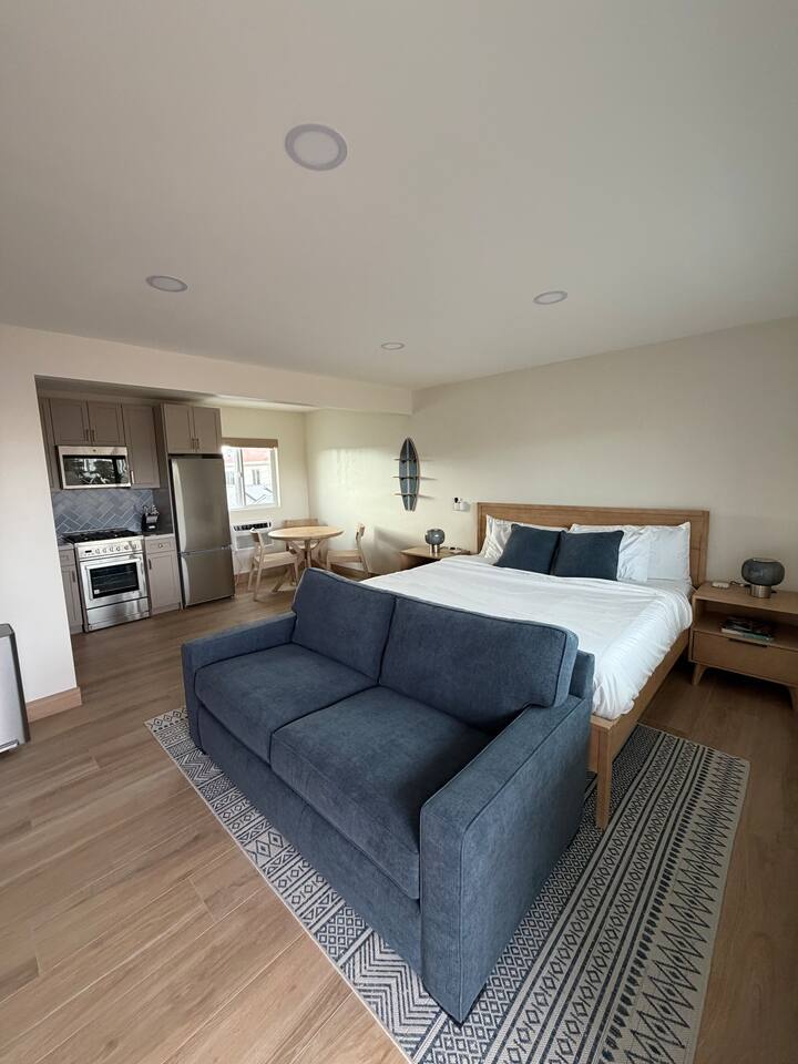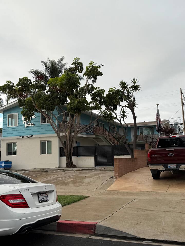 Welcome to the entire two-story building at 1244 Oliver Ave — a completely remodeled, light-filled multi-unit property right in the heart of Pacific Beach. Rent the whole building exclusively and enjoy 9 modern apartments: 8 identical ~400 sq ft studios (5 upstairs, 4 downstairs) and one spacious ~700 sq ft one-bedroom on the first floor, all finished with the same fresh, coastal-inspired design for seamless group accommodations. You’re steps from PB’s best: the beach, boardwalk, surf spots, epic sunsets, coffee shops, taco stands, and that signature relaxed-yet-energetic vibe. Arrival is simple with keyless entry — personal codes arrive the morning of check-in for easy access. Please note: The upstairs studios (5 units) require stairs (no elevator), while the downstairs studios (4 units) and the one-bedroom are fully first-floor with no stairs needed. Each studio offers a bright, open floor plan with large windows pouring in natural light, a luxurious premium king BedGear bed dressed in crisp hotel-quality linens and pillows for deep rest, a full-size queen sofa sleeper (sleeps up to 4 per unit), large nightstands with extension cords for charging, and roll-down blackout shades for complete light control and quiet mornings after PB evenings. The one-bedroom provides extra privacy and space: a separate bedroom with the same premium king BedGear setup as a true retreat (door for quiet rest), his-and-hers built-out closets for ample, organized storage of clothes, luggage, and beach gear, plus the open living area with queen sofa sleeper and a proper dining table seating four. Every unit includes a brand-new full kitchen: stainless steel appliances, generous counter space, plenty of storage, a Keurig coffee maker stocked with pods and sugar, cookware, dishes, utensils, and more. The spa-like bathrooms feature a deep tub with sleek sliding glass door, soft-close toilet, hair dryer, and full bathroom essentials. We’ve included the thoughtful details: beach chairs, Pack ’n Play, iron + ironing board, luggage racks, vacuum, basic cleaning supplies, hotel-quality linens, and plush beach towels available property-wide. Parking is a breeze with one dedicated spot per unit (9 total) — rare and valuable in Pacific Beach! Your group has exclusive use of the on-site shared laundry room featuring two high-efficiency stackable washers and dryers — completely complimentary, including detergent and dryer sheets (great for sandy beach days or travel laundry). Pet-friendly and family-friendly, this fresh, modern building feels like your private PB retreat — perfect for groups seeking individual units with shared ease. Spread out, relax in your own space, gather as needed, and fully enjoy Pacific Beach. Your perfect group headquarters awaits — come create lasting memories! STR-13359L STR-13328L STR-13361L STR-13374L STR-13269L STR-13352L STR-13351L STR-13340L STR-13329L TOT: 65992
