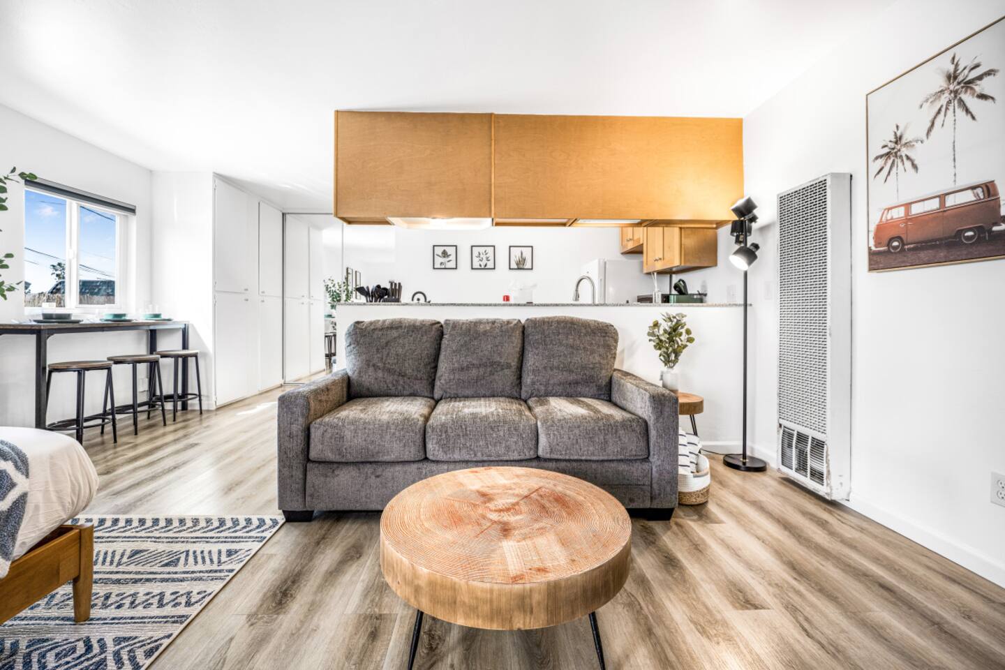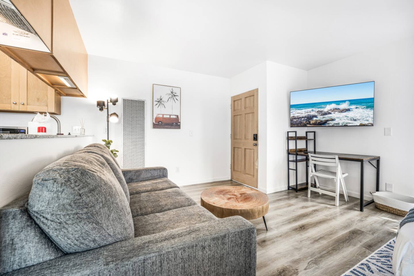Welcome to your perfect coastal retreat in Ocean Beach! This spacious, open-concept studio is the ideal escape for up to four guests, whether you're here for a romantic getaway, family vacation, or a solo retreat. With everything you need for comfort and relaxation, you'll feel right at home. Sleeping Arrangements: King-Size Bed: Rest easy on our luxurious memory foam mattress with hotel-quality linens, ensuring a restful night’s sleep. Queen-Size Pull-Out Bed: The large couch doubles as a queen-sized pull-out bed, offering additional sleeping space for two. Living Area: Spacious Couch: Relax on the oversized couch, perfect for lounging after a day of exploring. Smart TV: Stream your favorite shows or movies on the smart TV, complete with easy access to apps and services. Kitchen: Full Kitchen: Cook up your favorite meals with our fully equipped kitchen, featuring a stove, oven, microwave, refrigerator, and coffee maker, plus all the essentials. Dining Area: Enjoy meals in the cozy dining nook, with seating for three. Amenities: Beach Equipment: Make the most of your beach days with our provided umbrella, towels, and beach chairs. Essentials: Includes an iron, ironing board, and other necessities for a comfortable stay. Bathroom: Full Bathroom: Equipped with hotel-quality toiletries, including shampoo, conditioner, body soap, and lotion for a spa-like experience. Additional Features: A/C & Heating: Stay comfortable year-round with both air conditioning and heating. Parking: Enjoy the convenience of a compact parking space for your vehicle. Stair Access: Please note the home is on the second floor, so stairs are required for entry. Privacy: Enjoy peace and quiet with no neighbors above or below you during your stay. Location: Nestled in the heart of Ocean Beach, you're just a short stroll from the beach, local shops, restaurants, and the vibrant Ocean Beach scene. Whether you're here to surf, explore the local culture, or simply relax, this studio is the perfect home base. Book Your Stay: Experience the best of Ocean Beach in this cozy, well-appointed studio. Book now to start planning your perfect coastal getaway!