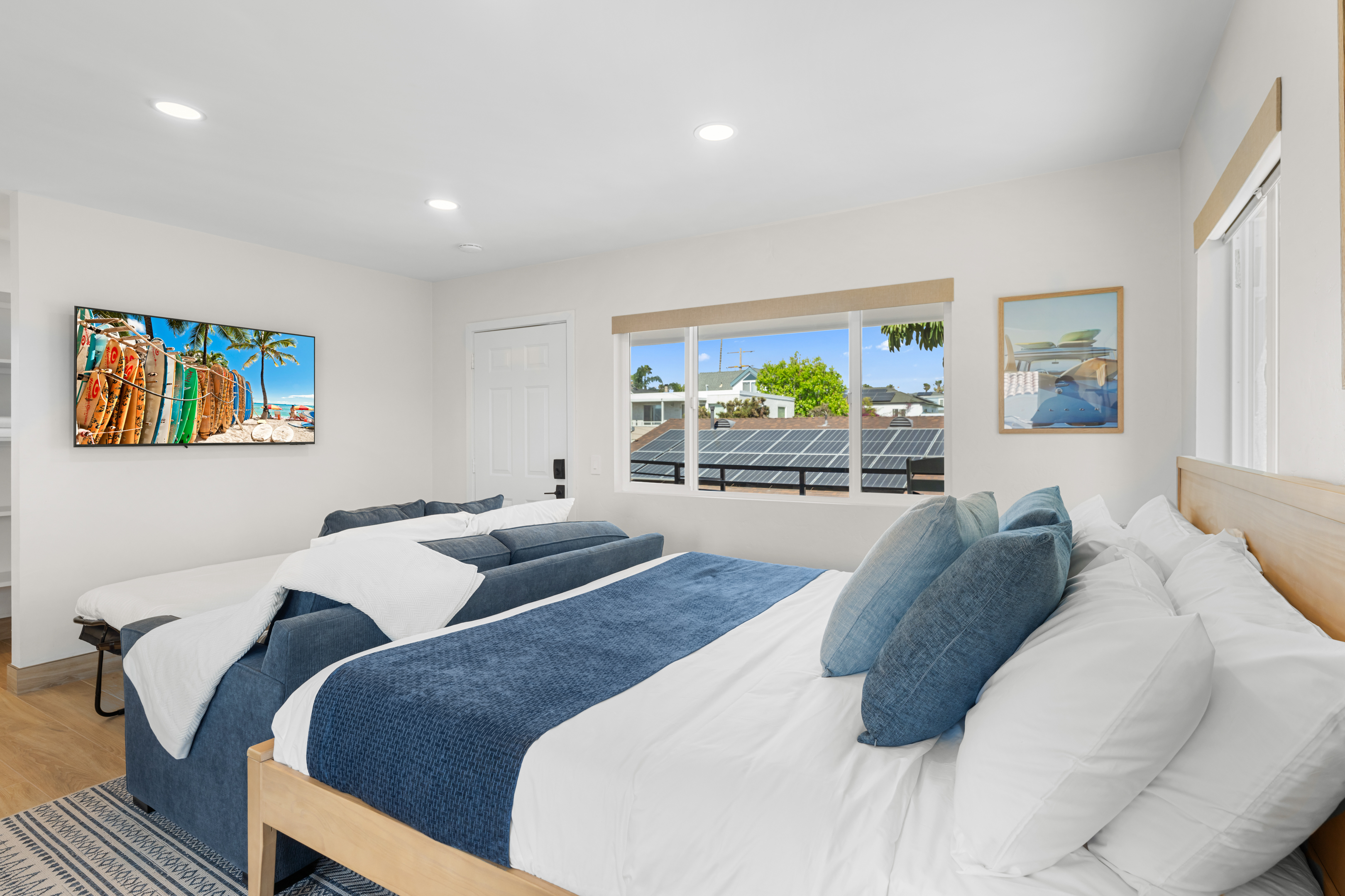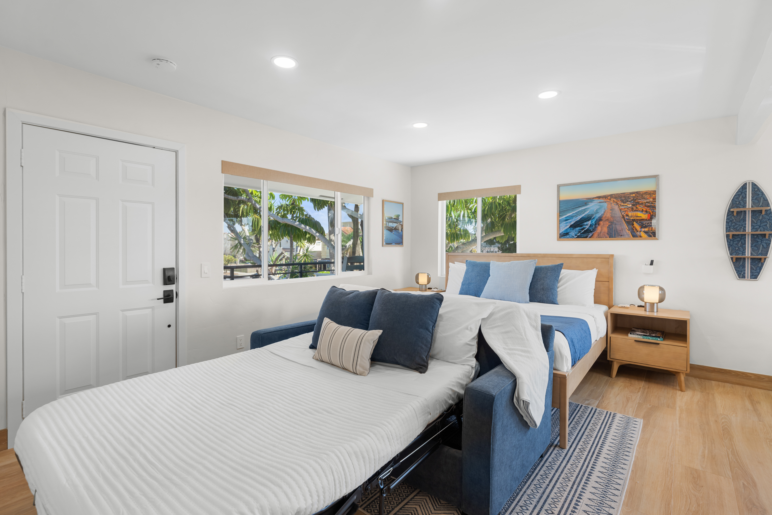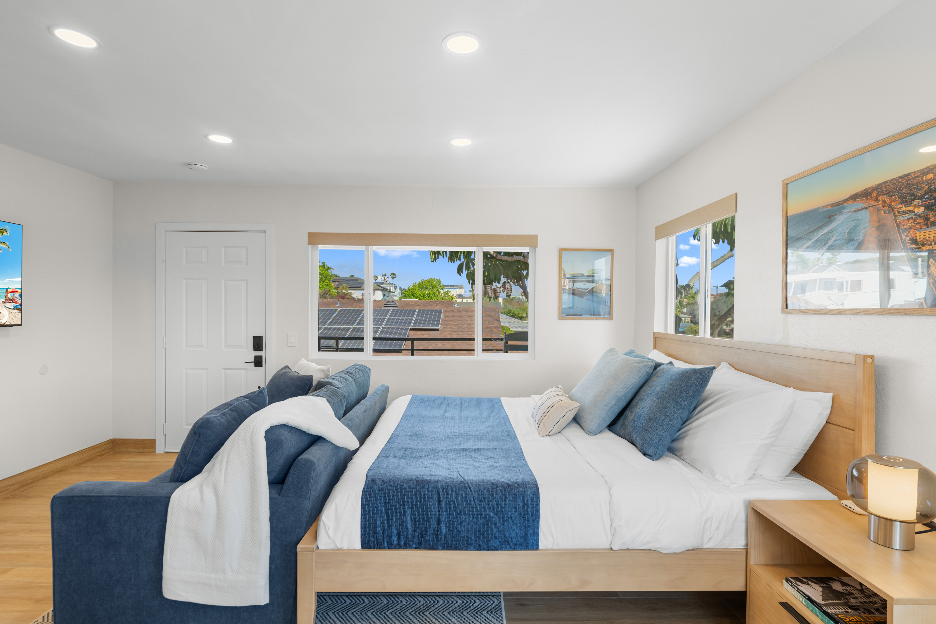 Welcome to a completely remodeled, light-filled second-floor studio in the heart of Pacific Beach. You’re just a short walk from the sand, boardwalk, surf breaks, sunset views, coffee shops, tacos, and the relaxed, lively PB energy everyone comes for. Arrival is effortless: one set of exterior stairs to reach the unit (no stairs inside the apartment), and no one above you for extra quiet and privacy. Keyless entry means you simply receive your personal code the morning of check-in and walk right in. Step inside to a bright, open floor plan with large windows that flood the space with natural light. At the center is a luxurious premium king BedGear bed — dressed in crisp hotel-quality linens and topped with pillows designed for deep, restful sleep. In front of the bed sits a comfortable sofa that pulls out into a full-size queen sleeper, easily sleeping 4 guests. Large nightstands with extension cords make overnight charging simple and tidy. Roll-down blackout shades cover every window, giving you total control over light and guaranteeing peaceful mornings no matter how late the PB nightlife runs. The full kitchen feels brand new and ready to use: stainless steel appliances, generous counter space, plenty of storage for anything you bring, and a Keurig coffee maker stocked with pods and sugar so your day starts right. Nearby is a proper dining table that seats four comfortably. The spa-like bathroom features a deep tub enclosed by a sleek sliding glass door, soft-close toilet, hair dryer, and a full set of bathroom essentials (shampoo, conditioner, body wash, body lotion). Just outside the bathroom you’ll find a handy desk/vanity area — perfect for work, makeup, or extra prep space. A large walk-in closet gives you tons of room for luggage, beach gear, clothes, and everything else you bring. We’ve thought of the little things too: beach chairs, Pack ’n Play, iron + ironing board, luggage rack, vacuum, and basic cleaning supplies are all provided. One dedicated parking spot is included — a true luxury in Pacific Beach. And to make life even easier (especially with little ones, beach towels, or packing up), guests have access to the on-site shared laundry room. We provide two stackable high-efficiency washers and dryers exclusively for our guests — completely complimentary, including detergent and dryer sheets. Pet-friendly and family-friendly, this fresh, modern studio feels clean, stylish, and perfectly set up for an effortless Pacific Beach getaway. Your ideal PB home base is ready — come make some memories! STR-13269L TOT: 659992
