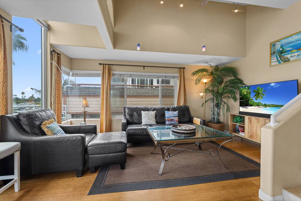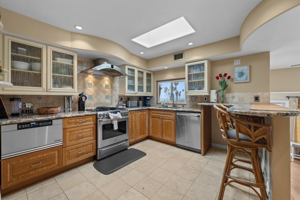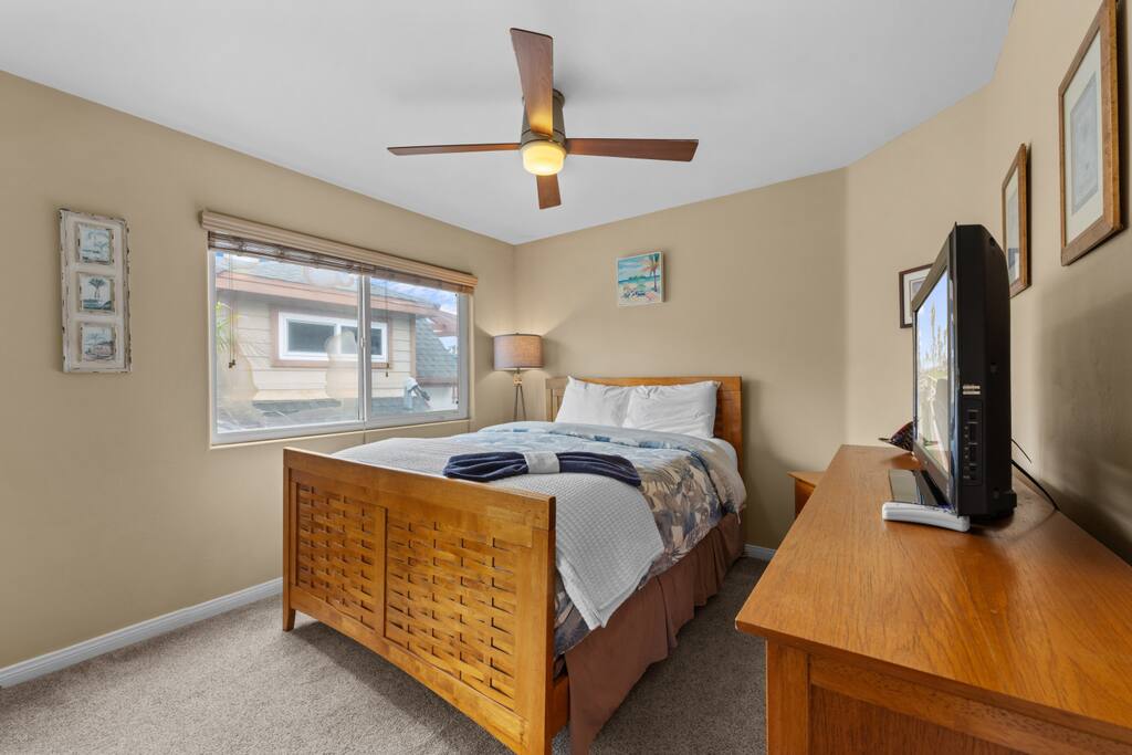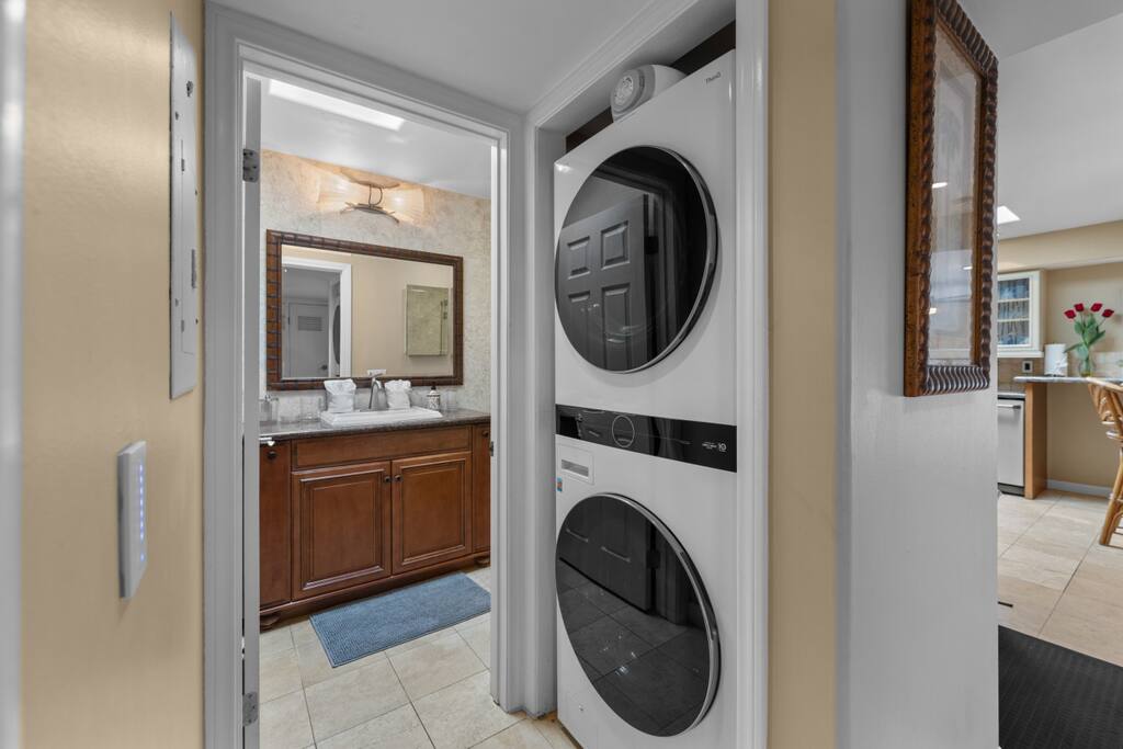 Welcome to your dream beach escape, perfectly positioned right across from the historic and vibrant Belmont Park in the heart of Mission Beach. This stylish and spacious 3-bedroom, 2-bath coastal retreat combines comfort, convenience, and location to deliver the ultimate Southern California getaway. As you arrive, you’ll have access to a private garage space on the ground level—ideal for one compact car, so you can park and forget it. From there, head up the exterior stairs to the second floor, where the home opens into a bright, airy living space designed for relaxation and connection. Step into the living room and you’ll immediately feel at home. With plenty of plush seating and a large Smart TV, it’s the perfect spot to unwind after a day in the sun. Sliding doors lead out to a balcony where you’ll be greeted with ocean breezes and stunning views of both Belmont Park and the beach—ideal for people-watching, sunset cocktails, or firing up the BBQ for a laid-back meal with friends or family. A short flight of stairs inside the home leads to the elevated heart of the house: a full-size kitchen equipped with everything you need—from modern appliances to cookware and dinnerware—making it easy to whip up a beachside breakfast or gourmet dinner. Just off the kitchen is a cozy dining nook with seating for four, creating the perfect space to enjoy meals together. Down the hall, you’ll find three beautifully appointed bedrooms and two full bathrooms: Two guest bedrooms each feature a comfortable queen-sized bed and share access to a sleek, full bathroom and a full-size washer and dryer—perfect for extended stays or sandy beach clothes. The primary bedroom is a private oasis, complete with a plush king-sized bed, ensuite bathroom, and a charming private balcony—your own little sanctuary to start or end the day. With the beach just steps away, and iconic attractions, restaurants, shops, and bars all within walking distance, this home offers an unbeatable location and all the comforts of home. Whether you're here to surf, stroll the boardwalk, explore Belmont Park, or simply relax and take in the ocean views, this Mission Beach retreat sets the scene for a truly unforgettable stay.