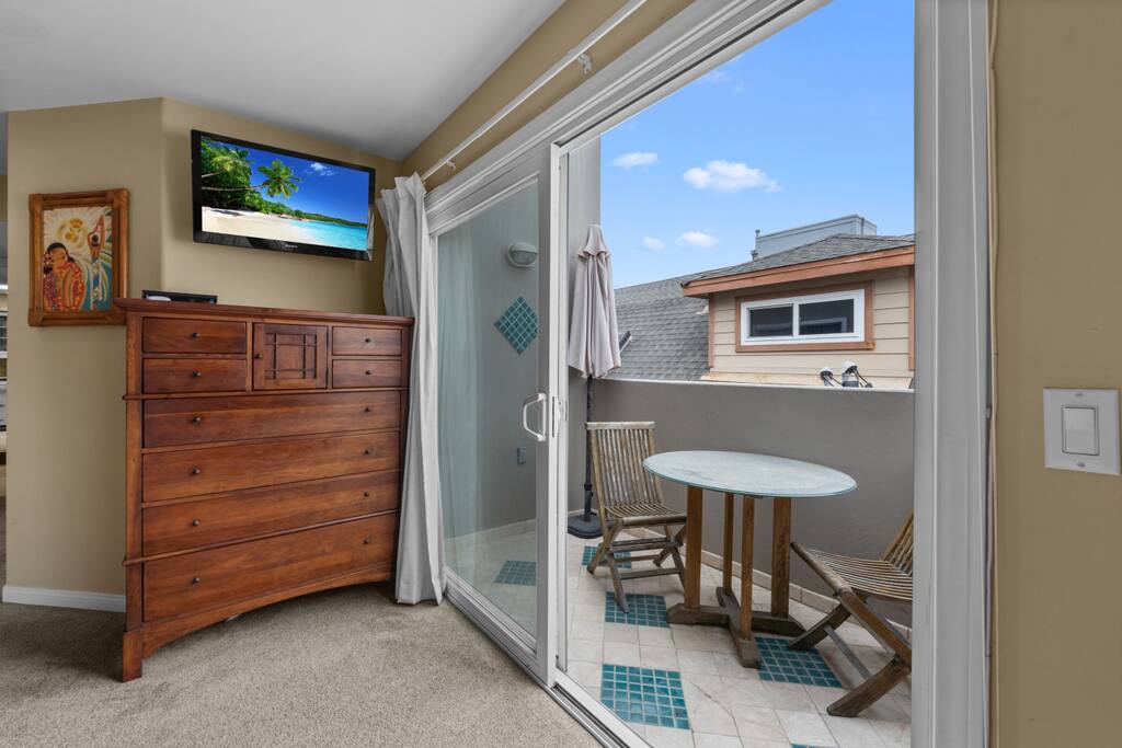 The entire second-floor unit – 3 bedrooms, 2 bathrooms, full kitchen, living and dining areas Private balcony off the living room with ocean and Belmont Park views, plus a BBQ grill Beach Gear Provided: Foam Surf Board, Boogie Board, Beach Chairs, Beach Umbrella and Beach Towels. Small private balcony off the primary bedroom Full kitchen stocked with cookware, utensils, dishes, and appliances Smart TVs in each bedroom and in the living room Full-size washer and dryer in-unit Garage parking for one compact car Please note: There are stairs required to enter the home and a small flight of stairs within the home between the main living area and the kitchen/bedrooms. You’ll also be just steps from the beach, boardwalk, and all the fun of Belmont Park—everything you need for the ultimate Mission Beach experience!