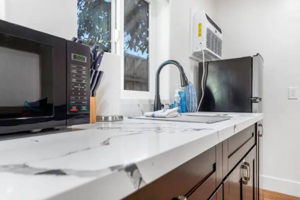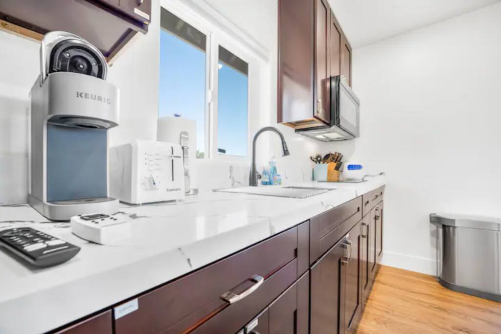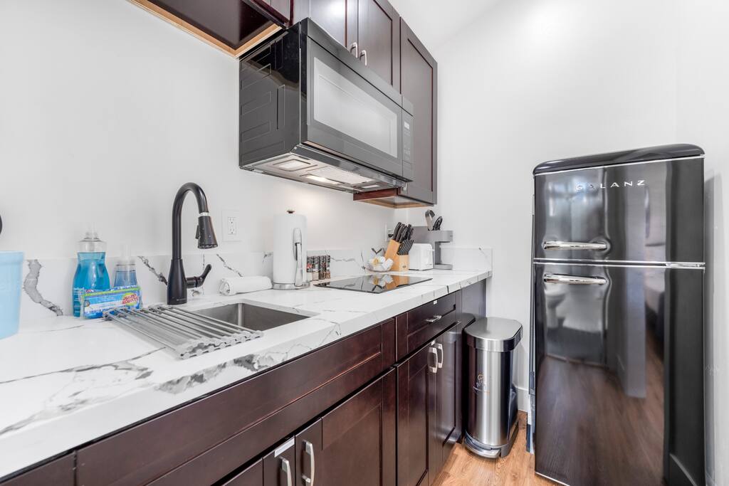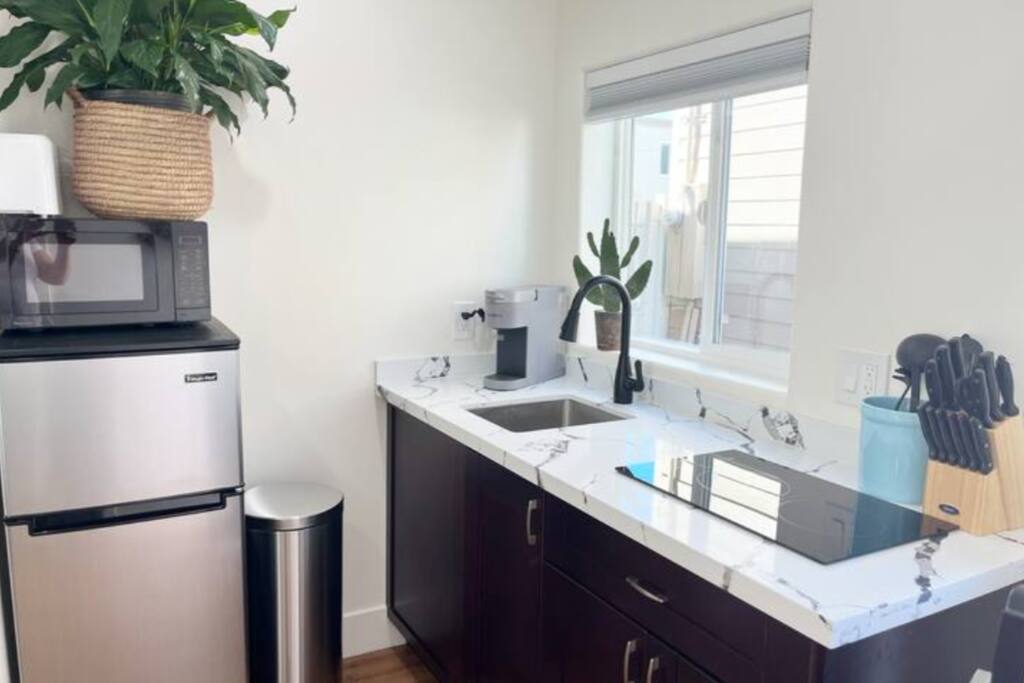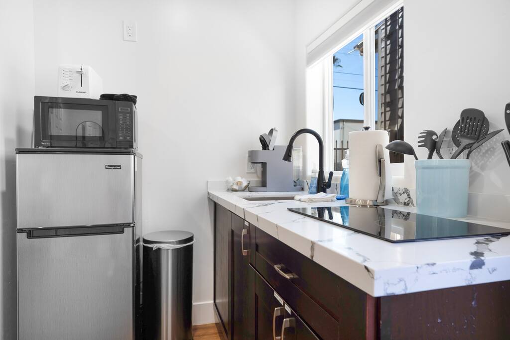 You have the entire compound of 4 units on the property including a massive patio and yard area great for entertaining! A gorgeous space to unwind and relax. Beautifully decorated with new designer furniture throughout. Really comfy new beds with high end linens. Your home away from home is equipped with everything you could possibly need for a long or short stay. Every detail has been considered to make your vacation a lasting memory. Enjoy sunsets from our patio. Our open plan living area with resort style couches, outdoor dining with BBQ grill for a wonderful dining experience. The open plan layout and large windows provide an abundance of natural light. This rental is for all 4 individual units on the property. Each unit has 1 full bathroom and a kitchen. The sleeping arrangements are: Unit 1: Loft style unit with a king bed up in the loft, a queen bed downstairs in the living room area, and a luxury futon style sofa in the living room area. Sleeps 5 guests comfortably. Unit 2: 1 bedroom unit with a queen bed in the bedroom with an ensuite bathroom and a queen sized pull out sofa in the living room area. Sleeps 4 guests comfortably. Unit 3: Studio unit with a king sized bed and a luxury futon style sofa both in the living room area. Sleeps 3 comfortably. Unit 4: 2 bedroom unit with a king bed in the primary bedroom, a bunk bed (twin and full beds) with an additional single bed in the second bedroom, and a luxury futon style sofa in the living room. The kitchens are very well equipped for your stay. We have an electric 2 burner stovetop, microwave, toaster, fridge, and freezer in each kitchen. There is no oven in any of the kitchens.
