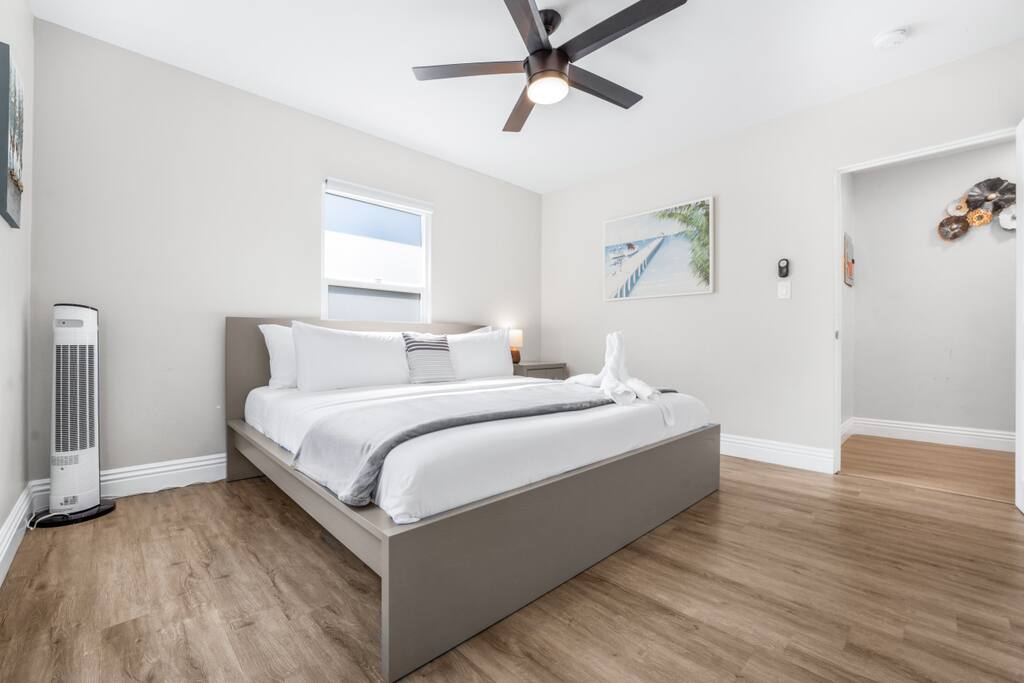 Stay just blocks from the sand in this spacious 3-bed, 2-bath Ocean Beach home. Each bedroom features a plush king bed, with an ensuite in the primary and a queen pullout couch for extra guests. Enjoy A/C for a comfy and cool stay. The private patio is made for relaxing—complete with cozy seating, a dining space, and BBQ grill for easy outdoor hangouts. Walk to the beach, OB Pier, local breweries, cafés, and unique shops. Beach towels and chairs are ready—just bring your flip-flops.