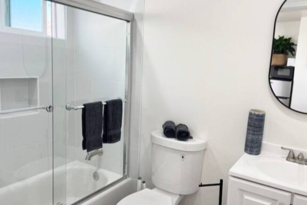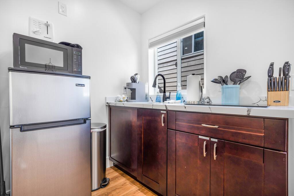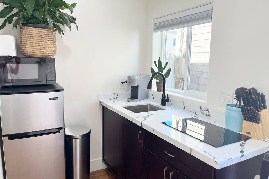 A gorgeous space to unwind and relax. Beautifully decorated with new designer furniture throughout. Space sleeps three comfortably. Enjoy sunsets from our patio. Our open plan living area with resort style couches, outdoor dining with BBQ grill for a wonderful dining experience. The open plan layout and large windows provide an abundance of natural light. Studio Space: One King size bed with luxury linens. Futon sofa with 55 inch Smart T.V and central AC. Kitchen: Fully stocked kitchen with all the essentials including two burner electric stove, microwave, refrigerator, and toaster. Keurig coffee maker, and coffee k-cups. We provide dish soap, sponge, trash bags, and paper towels. Bathroom: Fully stocked bathroom with the essentials including: shampoo, conditioner, body soap, and towels. Parking: One parking spot for a mid size SUV Shared Access Areas include: courtyard( with propane grill), washer & dryer, and outdoor shower.