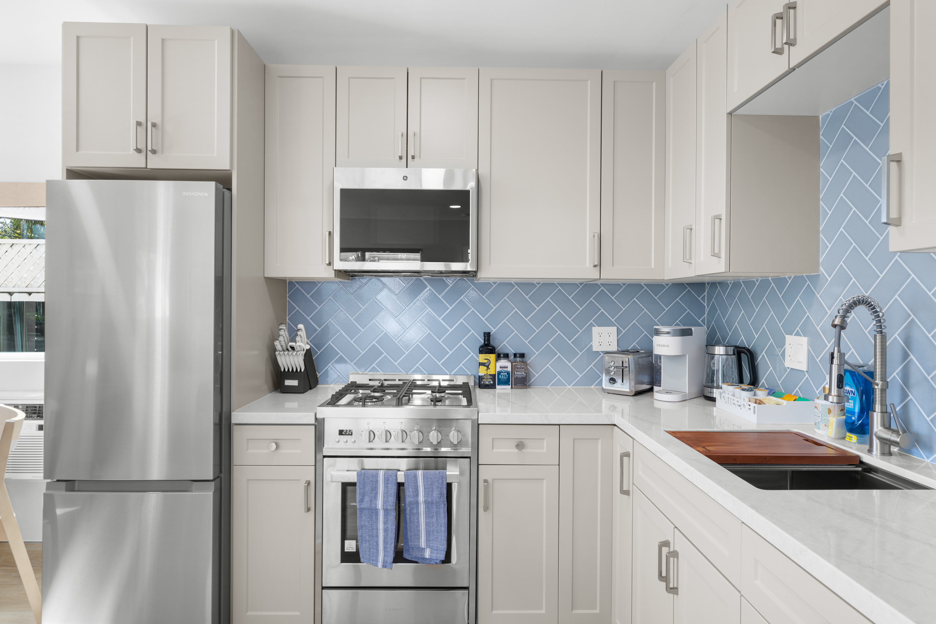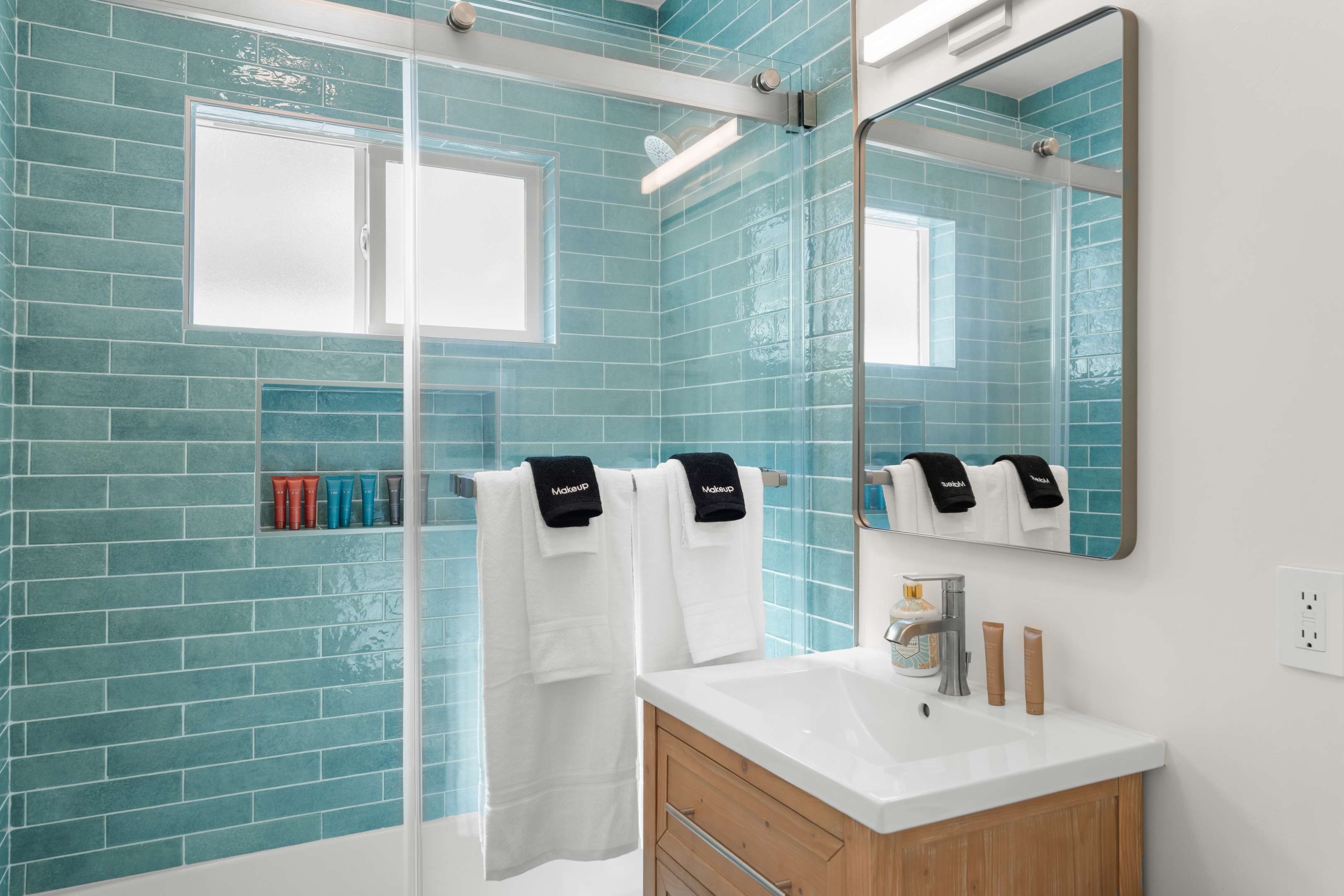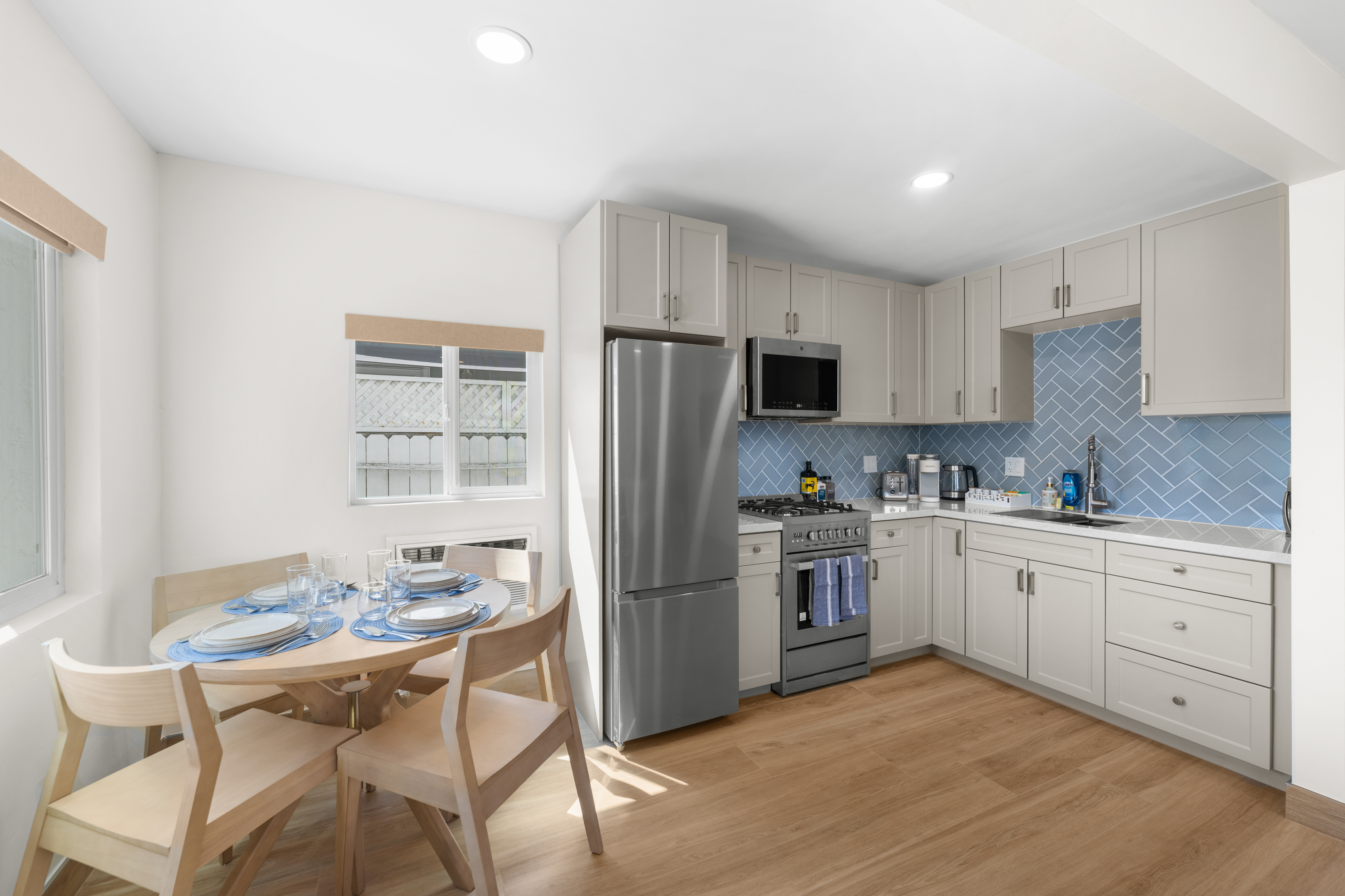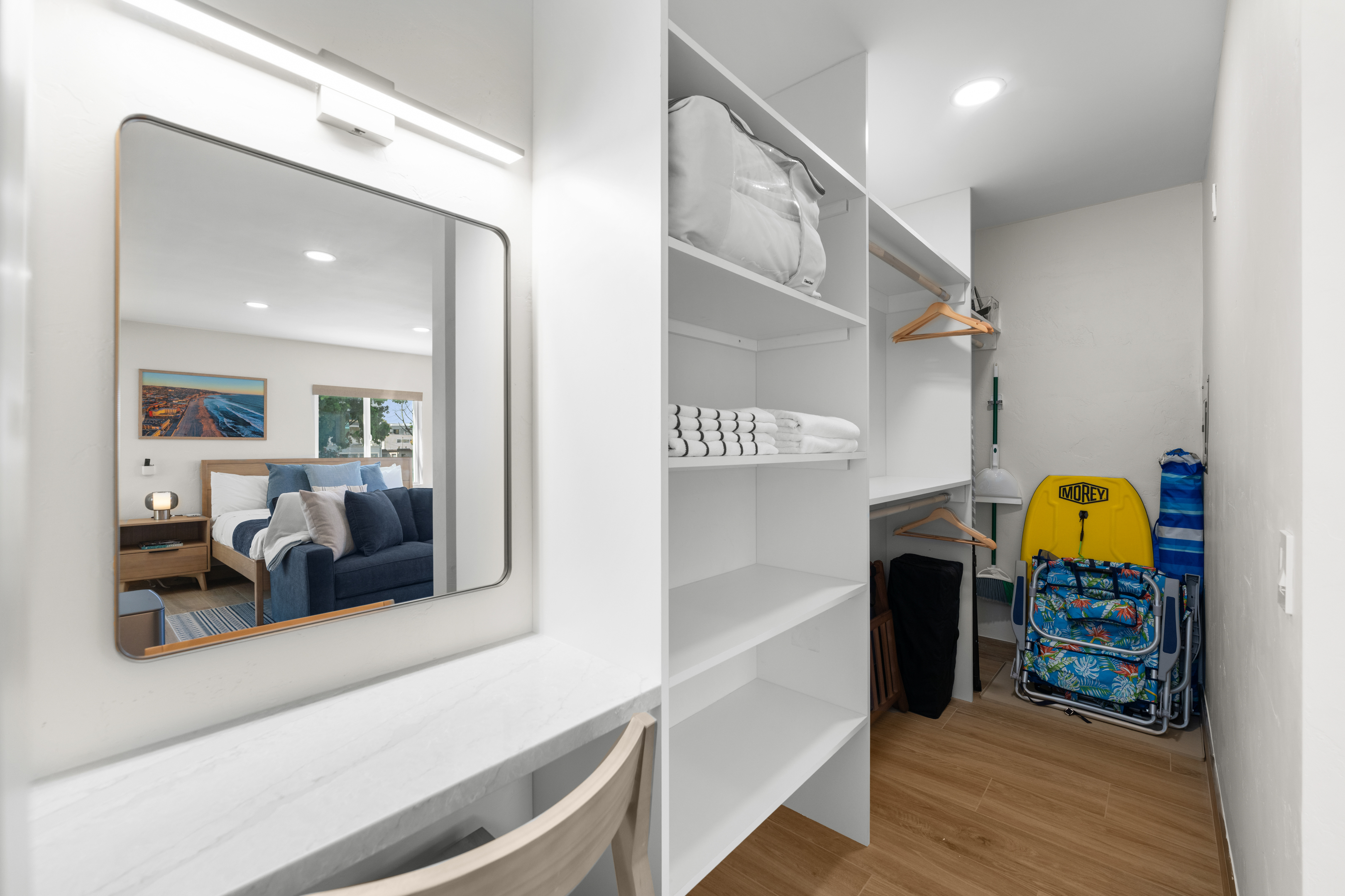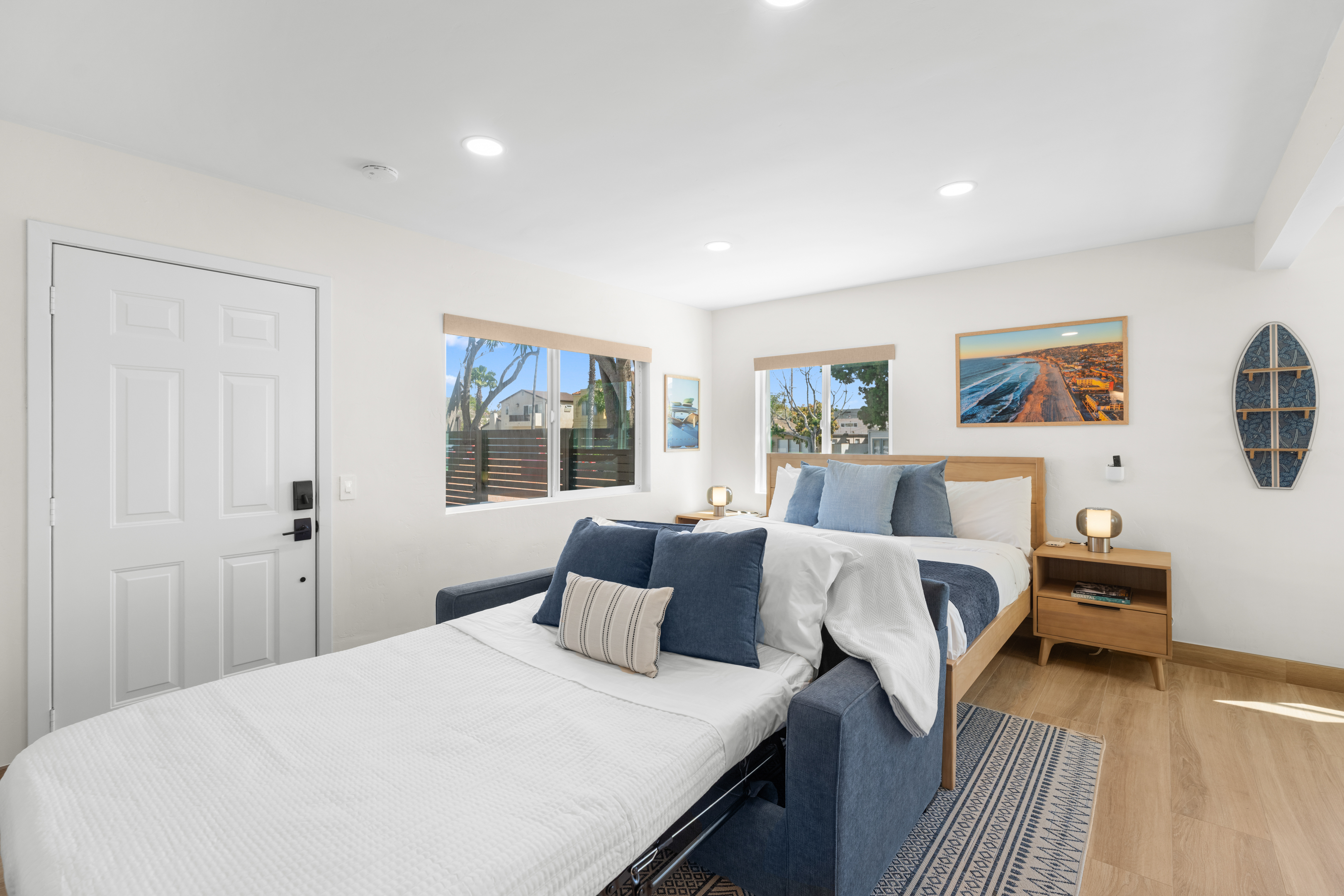 Welcome to a completely remodeled, light-filled first-floor studio in the heart of Pacific Beach. You’re just a short walk from the sand, boardwalk, surf breaks, sunset views, coffee shops, tacos, and the relaxed, lively PB energy everyone comes for. Arrival is effortless: no stairs to enter the apartment. Keyless entry means you simply receive your personal code the morning of check-in and walk right in. Step inside to a bright, open floor plan with large windows that flood the space with natural light. At the center is a luxurious premium king BedGear bed — dressed in crisp hotel-quality linens and topped with pillows designed for deep, restful sleep. In front of the bed sits a comfortable sofa that pulls out into a full-size queen sleeper, easily sleeping 4 guests. Large nightstands with extension cords make overnight charging simple and tidy. Roll-down blackout shades cover every window, giving you total control over light and guaranteeing peaceful mornings no matter how late the PB nightlife runs. The full kitchen feels brand new and ready to use: stainless steel appliances, generous counter space, plenty of storage for anything you bring, and a Keurig coffee maker stocked with pods and sugar so your day starts right. Nearby is a proper dining table that seats four comfortably. The spa-like bathroom features a deep tub enclosed by a sleek sliding glass door, soft-close toilet, hair dryer, and a full set of bathroom essentials (shampoo, conditioner, body wash, body lotion). Just outside the bathroom you’ll find a handy desk/vanity area — perfect for work, makeup, or extra prep space. A large walk-in closet gives you tons of room for luggage, beach gear, clothes, and everything else you bring. We’ve thought of the little things too: beach chairs, Pack ’n Play, iron + ironing board, luggage rack, vacuum, and basic cleaning supplies are all provided. One dedicated parking spot is included — a true luxury in Pacific Beach. And to make life even easier (especially with little ones, beach towels, or packing up), guests have access to the on-site shared laundry room. We provide two stackable high-efficiency washers and dryers exclusively for our guests — completely complimentary, including detergent and dryer sheets. Pet-friendly and family-friendly, this fresh, modern studio feels clean, stylish, and perfectly set up for an effortless Pacific Beach getaway. Your ideal PB home base is ready — come make some memories! STR-13359L TOT: 659992