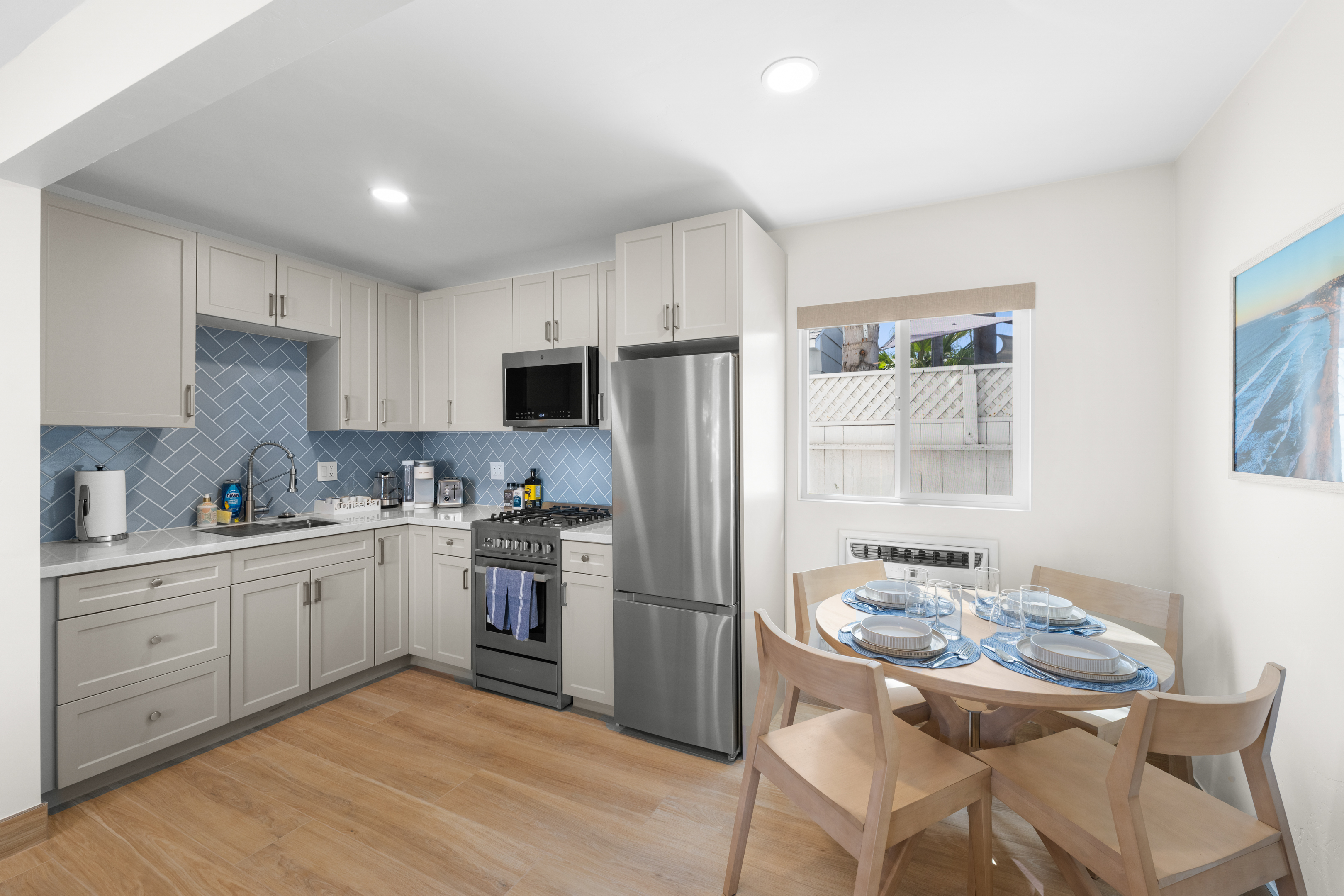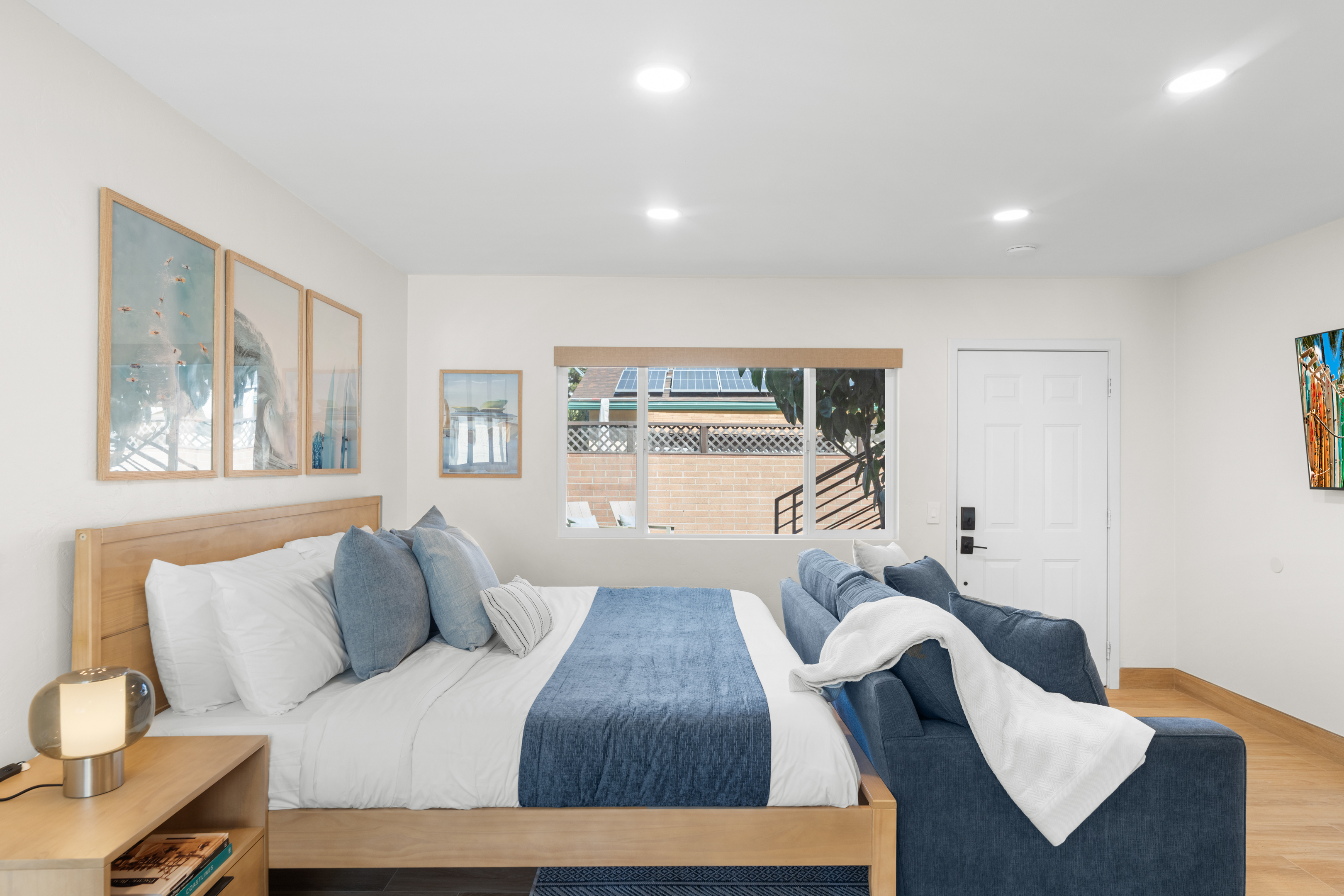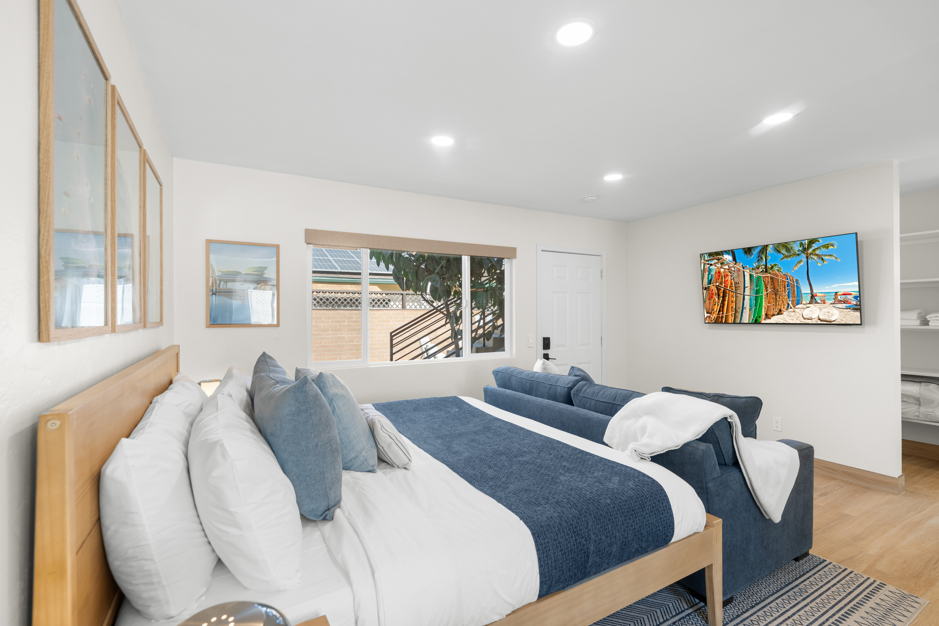 Welcome to a completely remodeled, light-filled first-floor studio in the heart of Pacific Beach. You’re just a short walk from the sand, boardwalk, surf breaks, sunset views, coffee shops, tacos, and the relaxed, lively PB energy everyone comes for. Arrival is effortless: no stairs to enter the apartment. Keyless entry means you simply receive your personal code the morning of check-in and walk right in. Step inside to a bright, open floor plan with large windows that flood the space with natural light. At the center is a luxurious premium king BedGear bed — dressed in crisp hotel-quality linens and topped with pillows designed for deep, restful sleep. In front of the bed sits a comfortable sofa that pulls out into a full-size queen sleeper, easily sleeping 4 guests. Large nightstands with extension cords make overnight charging simple and tidy. Roll-down blackout shades cover every window, giving you total control over light and guaranteeing peaceful mornings no matter how late the PB nightlife runs. The full kitchen feels brand new and ready to use: stainless steel appliances, generous counter space, plenty of storage for anything you bring, and a Keurig coffee maker stocked with pods and sugar so your day starts right. Nearby is a proper dining table that seats four comfortably. The spa-like bathroom features a deep tub enclosed by a sleek sliding glass door, soft-close toilet, hair dryer, and a full set of bathroom essentials (shampoo, conditioner, body wash, body lotion). Just outside the bathroom you’ll find a handy desk/vanity area — perfect for work, makeup, or extra prep space. A large walk-in closet gives you tons of room for luggage, beach gear, clothes, and everything else you bring. We’ve thought of the little things too: beach chairs, Pack ’n Play, iron + ironing board, luggage rack, vacuum, and basic cleaning supplies are all provided. One dedicated parking spot is included — a true luxury in Pacific Beach. And to make life even easier (especially with little ones, beach towels, or packing up), guests have access to the on-site shared laundry room. We provide two stackable high-efficiency washers and dryers exclusively for our guests — completely complimentary, including detergent and dryer sheets. Pet-friendly and family-friendly, this fresh, modern studio feels clean, stylish, and perfectly set up for an effortless Pacific Beach getaway. Your ideal PB home base is ready — come make some memories! STR-13328L TOT: 659992