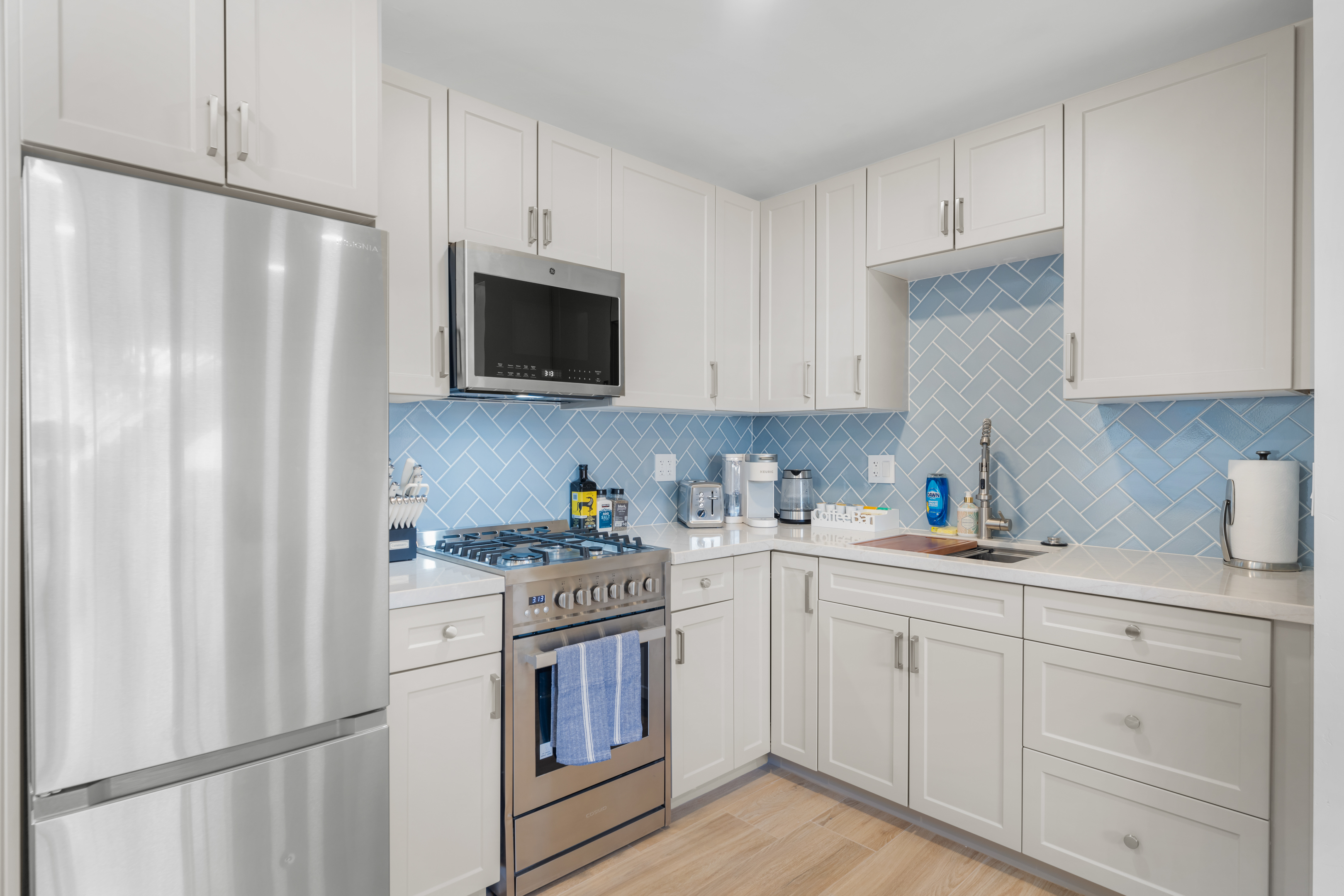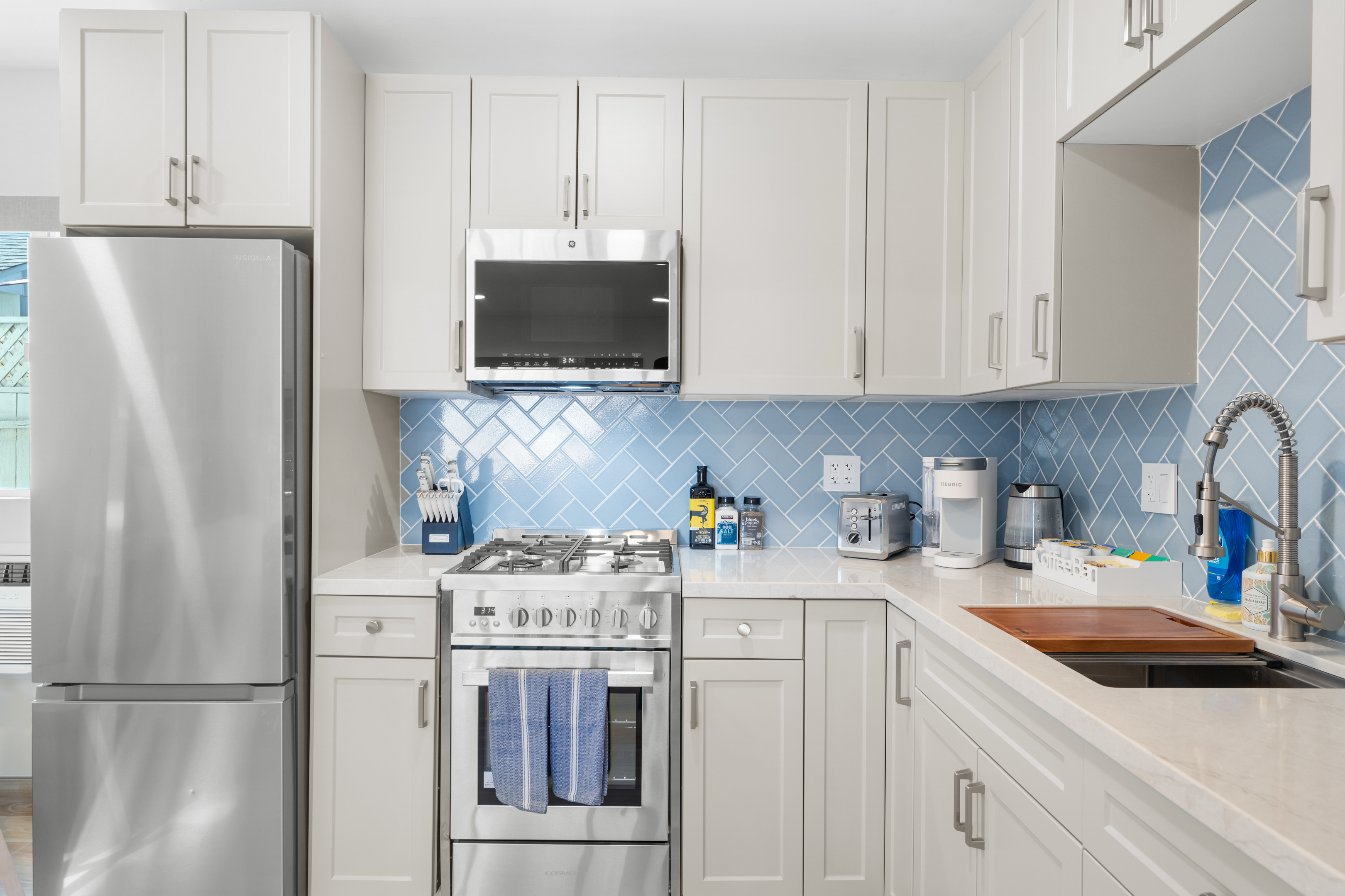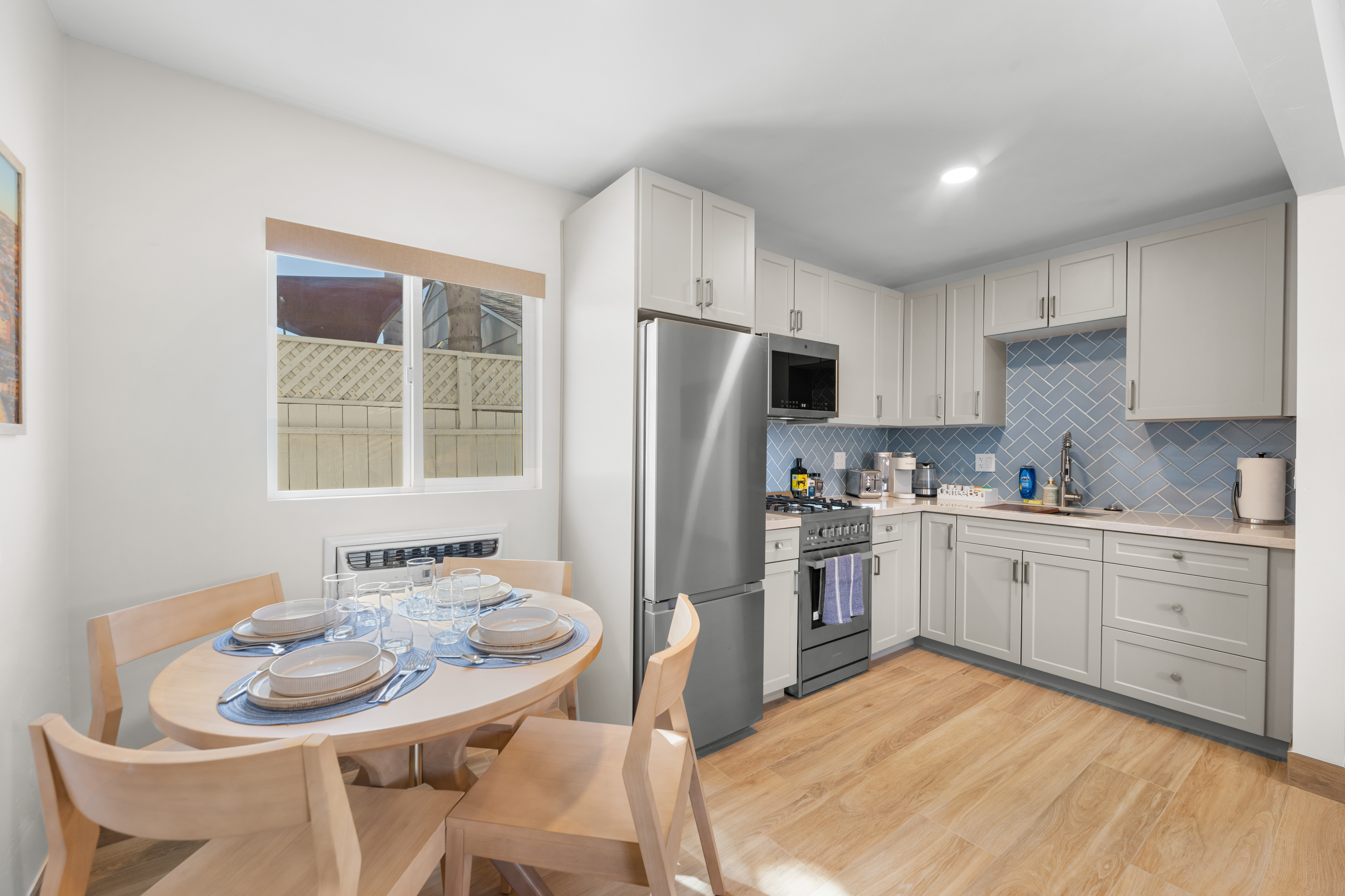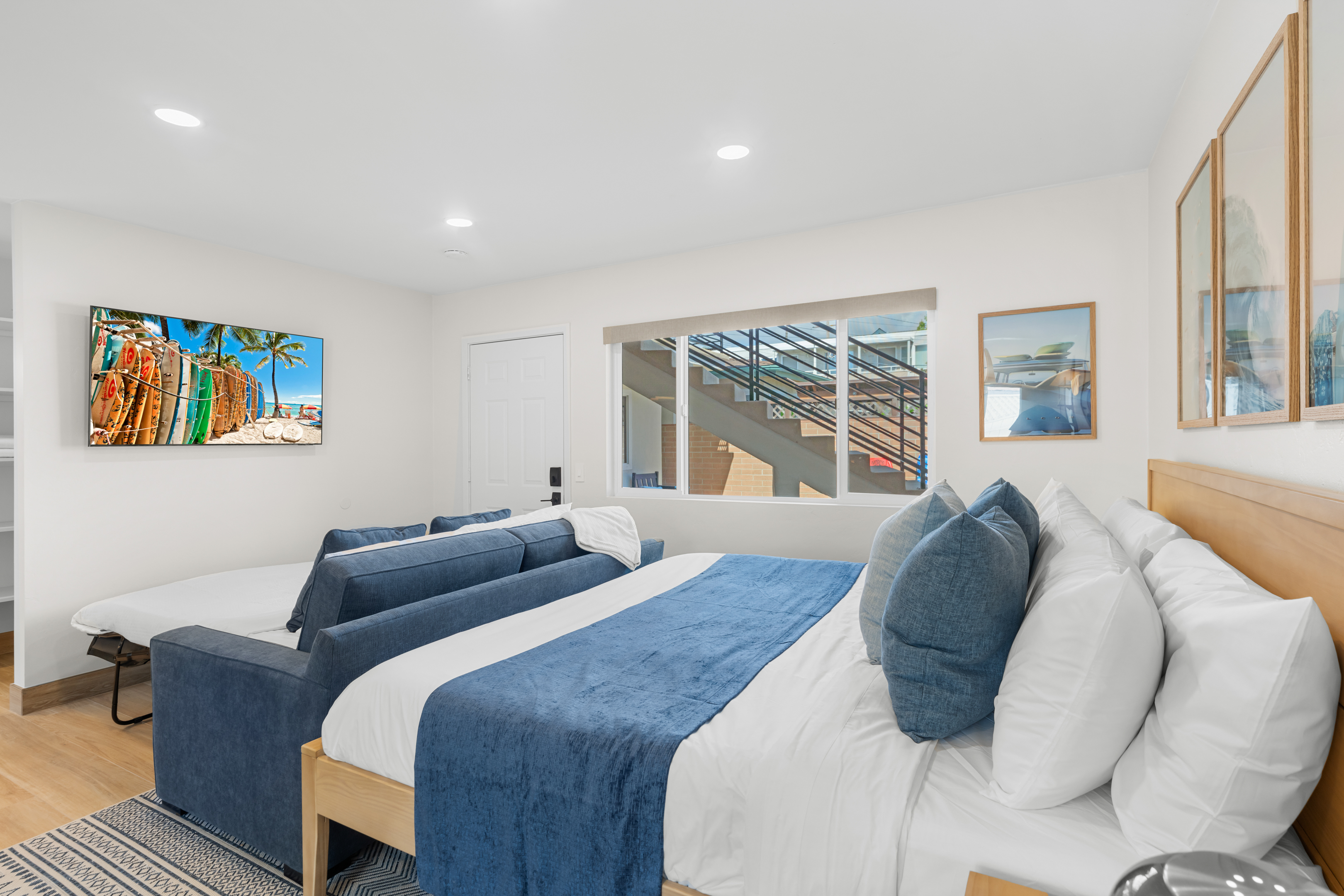 Welcome to a completely remodeled, light-filled first-floor studio in the heart of Pacific Beach. You’re just a short walk from the sand, boardwalk, surf breaks, sunset views, coffee shops, tacos, and the relaxed, lively PB energy everyone comes for. Arrival is effortless: no stairs to enter the apartment. Keyless entry means you simply receive your personal code the morning of check-in and walk right in. Step inside to a bright, open floor plan with large windows that flood the space with natural light. At the center is a luxurious premium king BedGear bed — dressed in crisp hotel-quality linens and topped with pillows designed for deep, restful sleep. In front of the bed sits a comfortable sofa that pulls out into a full-size queen sleeper, easily sleeping 4 guests. Large nightstands with extension cords make overnight charging simple and tidy. Roll-down blackout shades cover every window, giving you total control over light and guaranteeing peaceful mornings no matter how late the PB nightlife runs. The full kitchen feels brand new and ready to use: stainless steel appliances, generous counter space, plenty of storage for anything you bring, and a Keurig coffee maker stocked with pods and sugar so your day starts right. Nearby is a proper dining table that seats four comfortably. The spa-like bathroom features a deep tub enclosed by a sleek sliding glass door, soft-close toilet, hair dryer, and a full set of bathroom essentials (shampoo, conditioner, body wash, body lotion). Just outside the bathroom you’ll find a handy desk/vanity area — perfect for work, makeup, or extra prep space. A large walk-in closet gives you tons of room for luggage, beach gear, clothes, and everything else you bring. We’ve thought of the little things too: beach chairs, Pack ’n Play, iron + ironing board, luggage rack, vacuum, and basic cleaning supplies are all provided. One dedicated parking spot is included — a true luxury in Pacific Beach. And to make life even easier (especially with little ones, beach towels, or packing up), guests have access to the on-site shared laundry room. We provide two stackable high-efficiency washers and dryers exclusively for our guests — completely complimentary, including detergent and dryer sheets. Pet-friendly and family-friendly, this fresh, modern studio feels clean, stylish, and perfectly set up for an effortless Pacific Beach getaway. Your ideal PB home base is ready — come make some memories! STR-13361L TOT: 659992