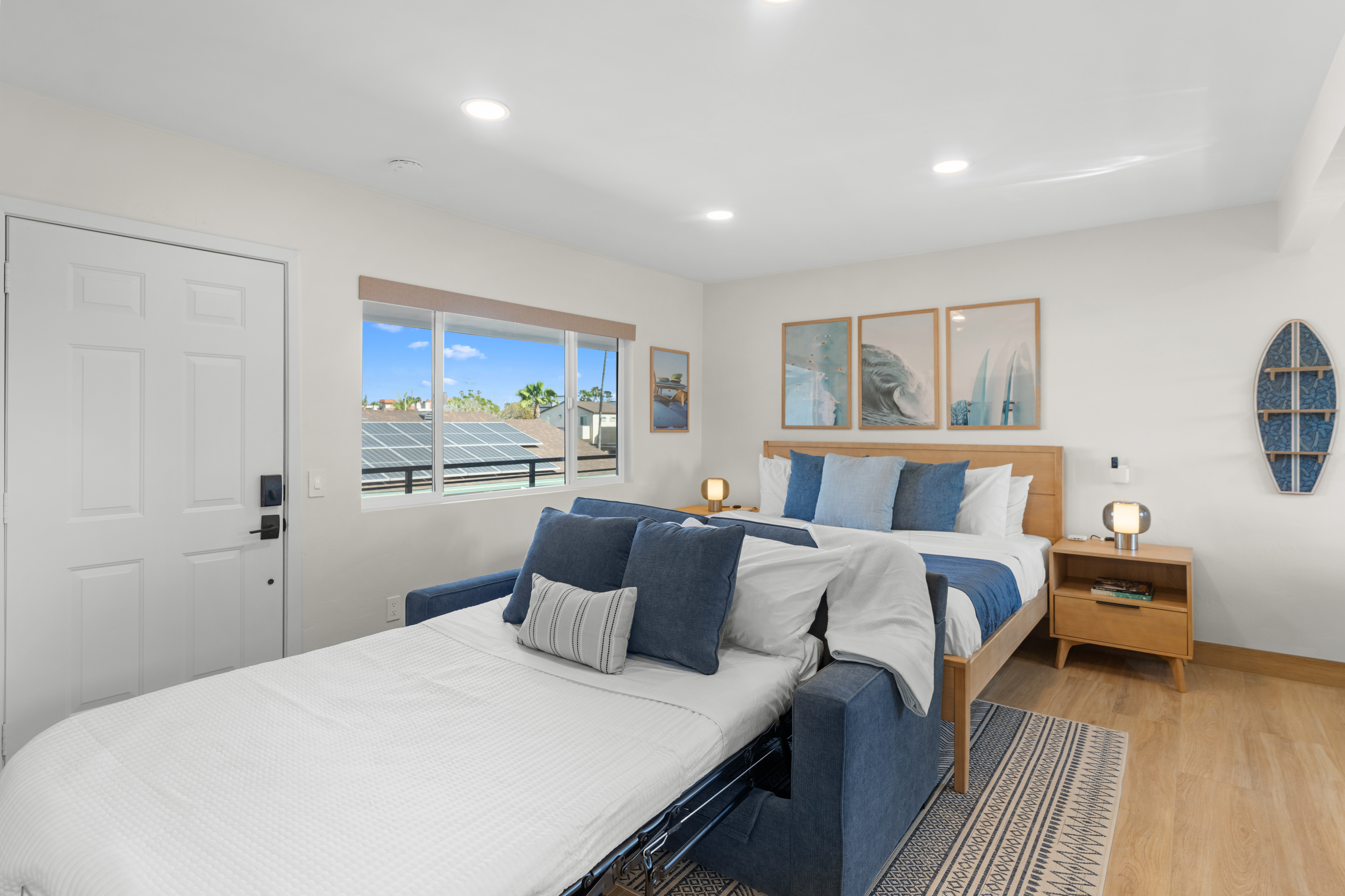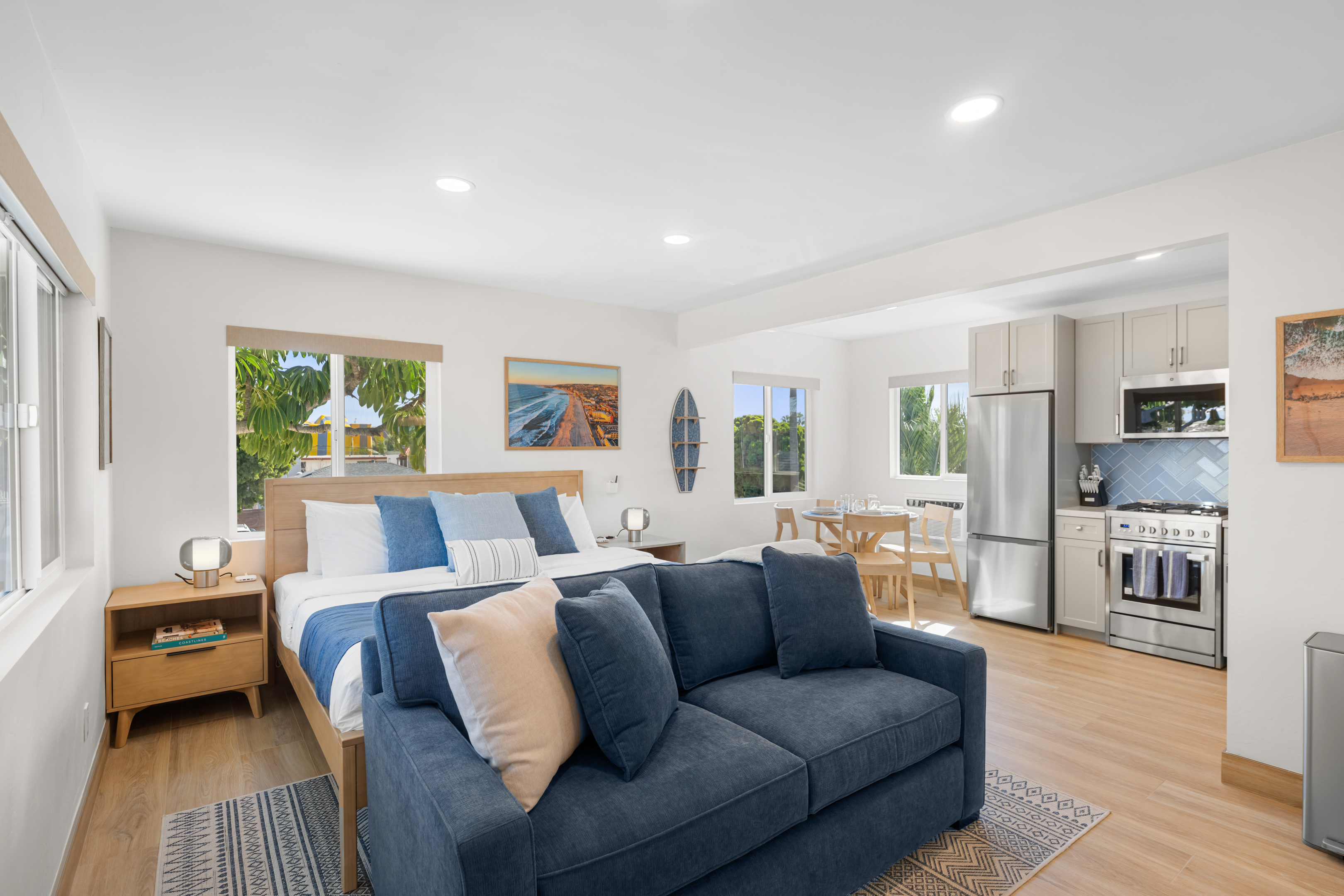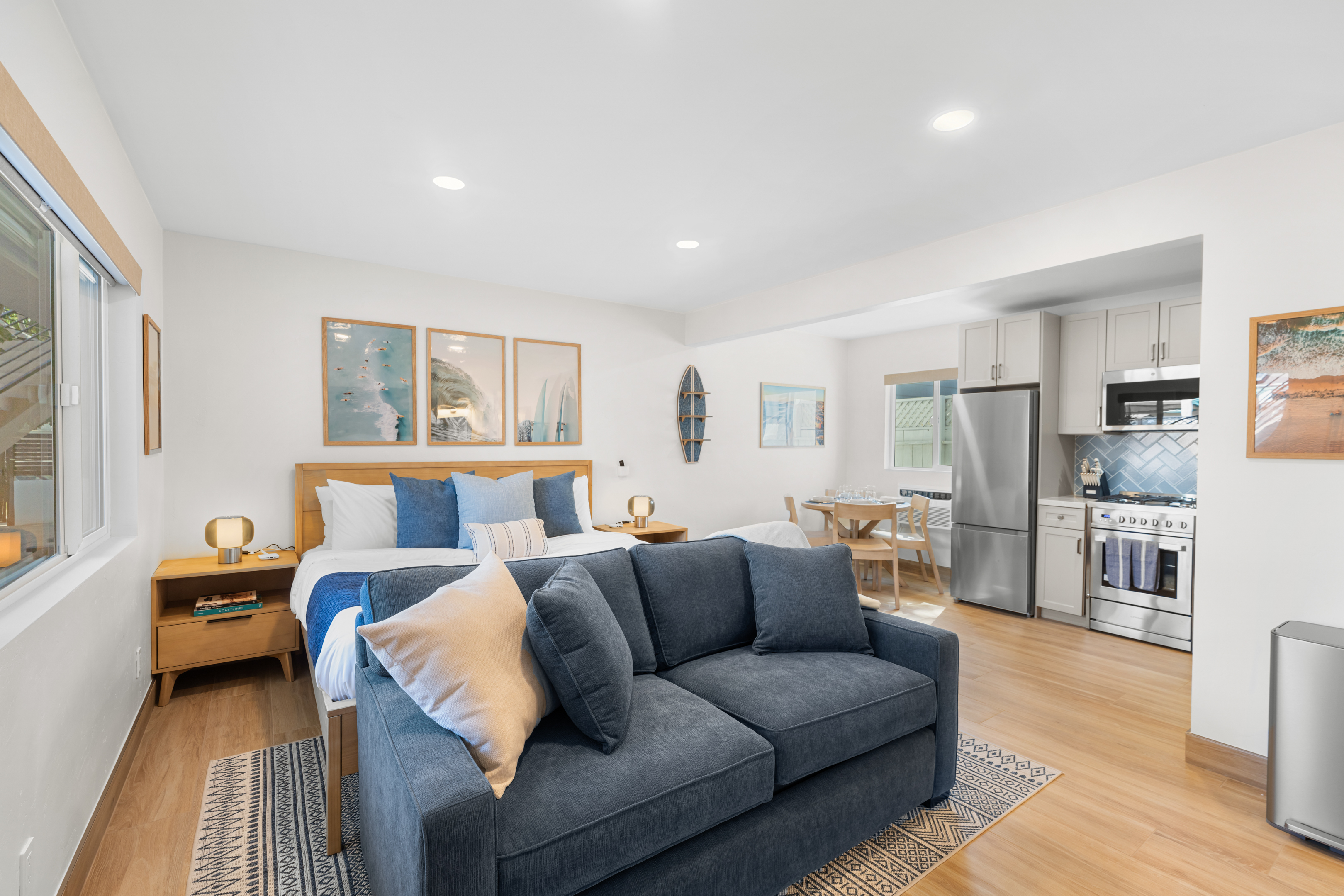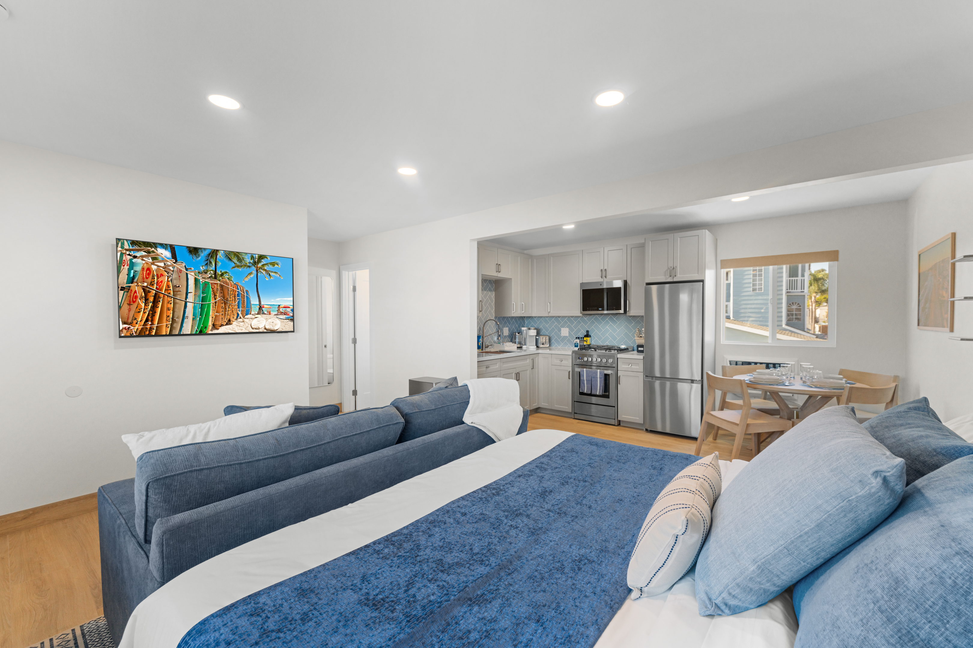 Welcome to the entire two-story building at 1244 Oliver Ave — a completely remodeled, light-filled multi-unit property right in the heart of Pacific Beach. Rent the whole building exclusively and enjoy 9 modern apartments: 8 identical ~400 sq ft studios (5 upstairs, 4 downstairs) and one spacious ~700 sq ft one-bedroom on the first floor, all finished with the same fresh, coastal-inspired design for seamless group accommodations. You’re steps from PB’s best: the beach, boardwalk, surf spots, epic sunsets, coffee shops, taco stands, and that signature relaxed-yet-energetic vibe. Arrival is simple with keyless entry — personal codes arrive the morning of check-in for easy access. Please note: The upstairs studios (5 units) require stairs (no elevator), while the downstairs studios (4 units) and the one-bedroom are fully first-floor with no stairs needed. Each studio offers a bright, open floor plan with large windows pouring in natural light, a luxurious premium king BedGear bed dressed in crisp hotel-quality linens and pillows for deep rest, a full-size queen sofa sleeper (sleeps up to 4 per unit), large nightstands with extension cords for charging, and roll-down blackout shades for complete light control and quiet mornings after PB evenings. The one-bedroom provides extra privacy and space: a separate bedroom with the same premium king BedGear setup as a true retreat (door for quiet rest), his-and-hers built-out closets for ample, organized storage of clothes, luggage, and beach gear, plus the open living area with queen sofa sleeper and a proper dining table seating four. Every unit includes a brand-new full kitchen: stainless steel appliances, generous counter space, plenty of storage, a Keurig coffee maker stocked with pods and sugar, cookware, dishes, utensils, and more. The spa-like bathrooms feature a deep tub with sleek sliding glass door, soft-close toilet, hair dryer, and full bathroom essentials. We’ve included the thoughtful details: beach chairs, Pack ’n Play, iron + ironing board, luggage racks, vacuum, basic cleaning supplies, hotel-quality linens, and plush beach towels available property-wide. Parking is a breeze with one dedicated spot per unit (9 total) — rare and valuable in Pacific Beach! Your group has exclusive use of the on-site shared laundry room featuring two high-efficiency stackable washers and dryers — completely complimentary, including detergent and dryer sheets (great for sandy beach days or travel laundry). Pet-friendly and family-friendly, this fresh, modern building feels like your private PB retreat — perfect for groups seeking individual units with shared ease. Spread out, relax in your own space, gather as needed, and fully enjoy Pacific Beach. Your perfect group headquarters awaits — come create lasting memories! STR-13359L STR-13328L STR-13361L STR-13374L STR-13269L STR-13352L STR-13351L STR-13340L STR-13329L TOT: 65992