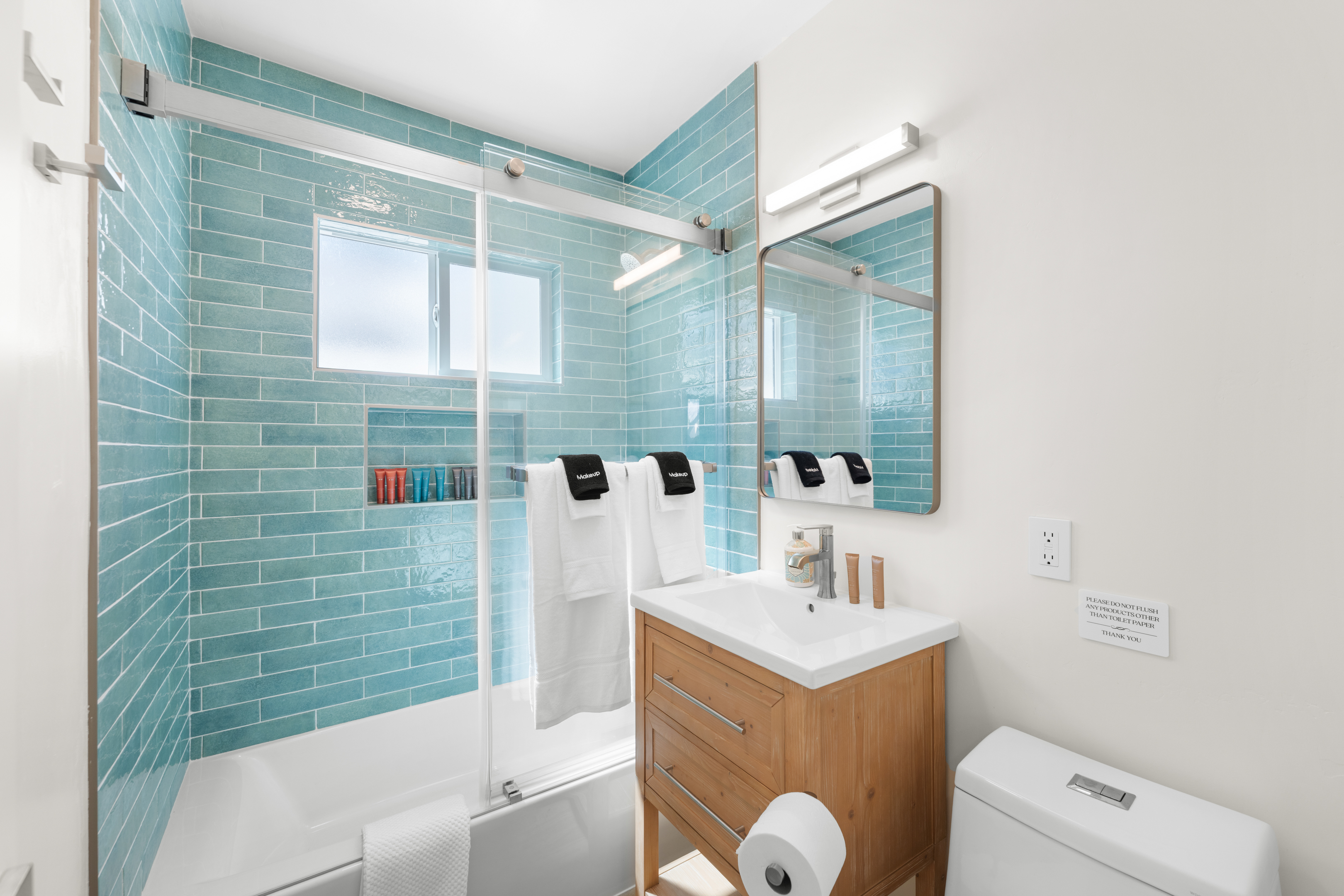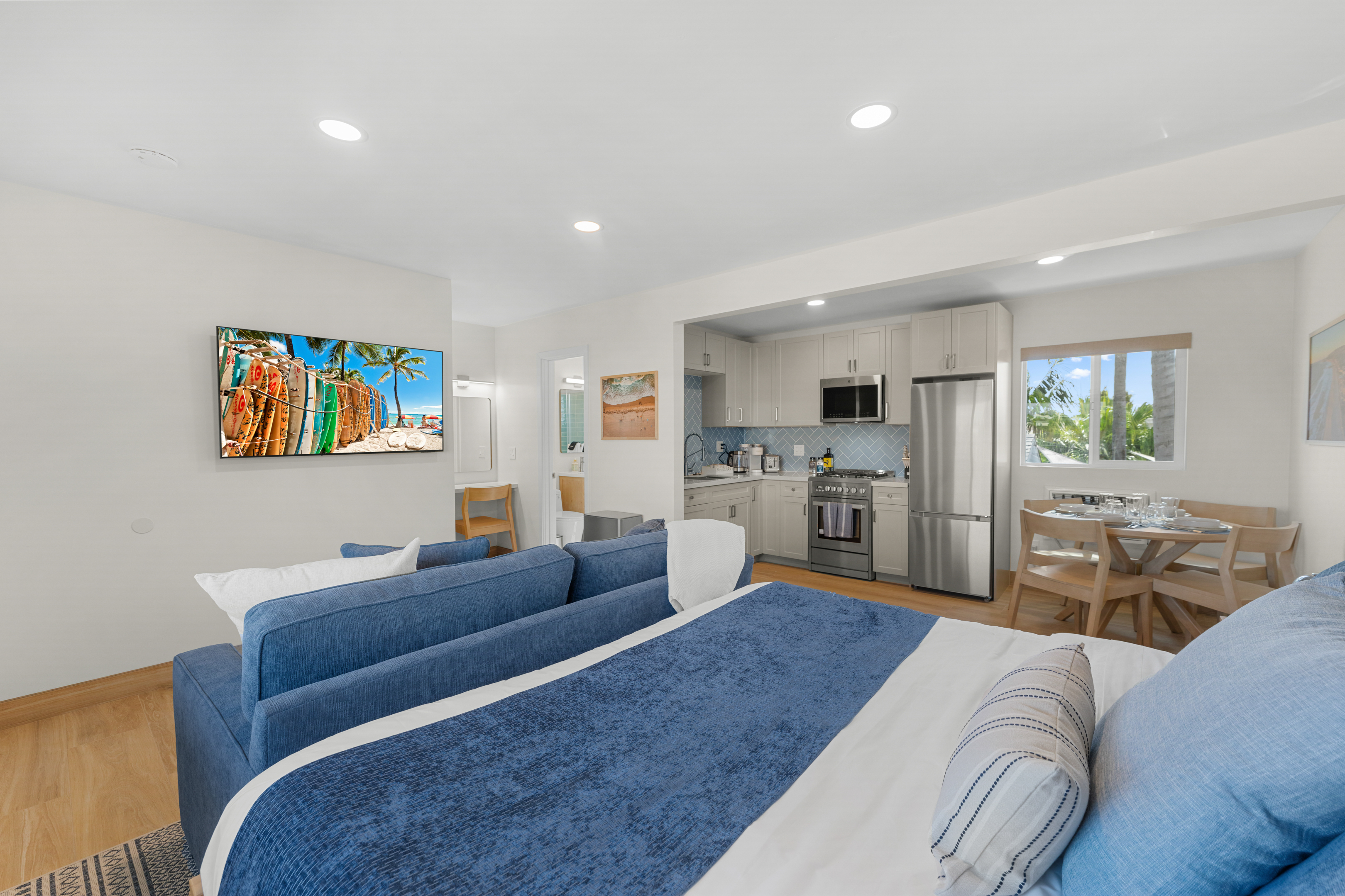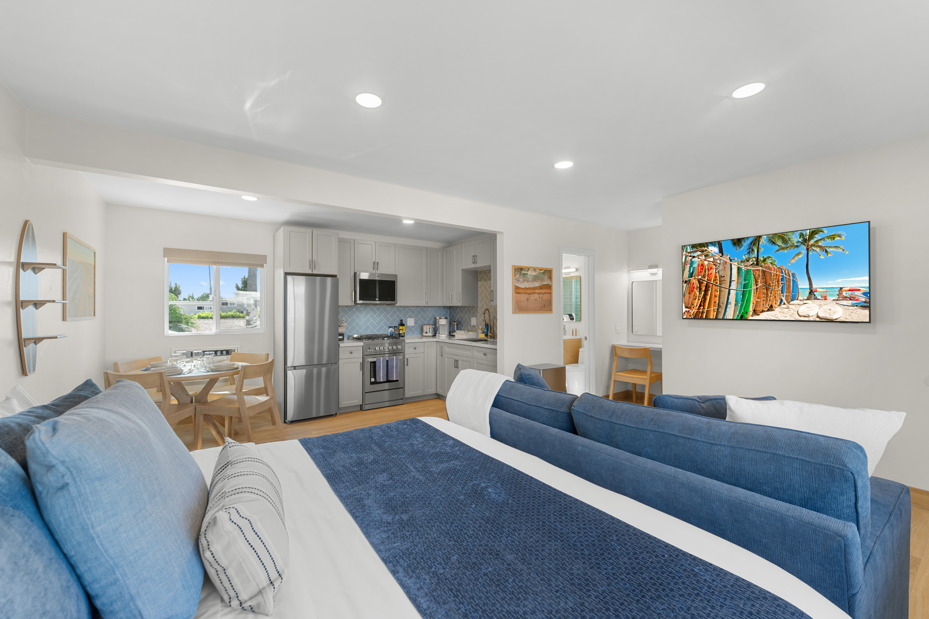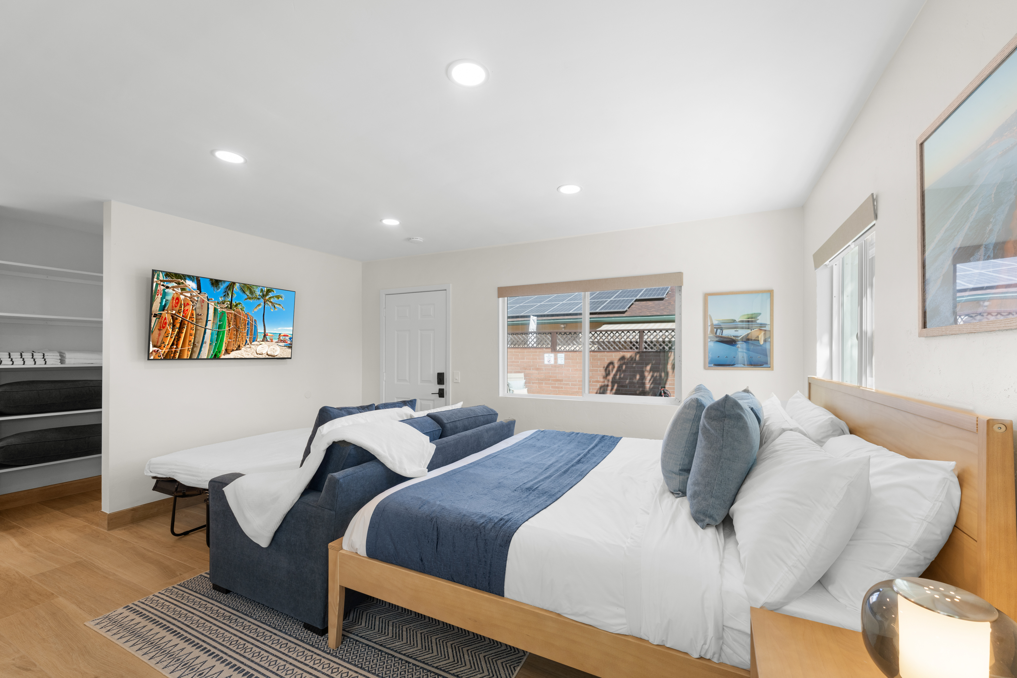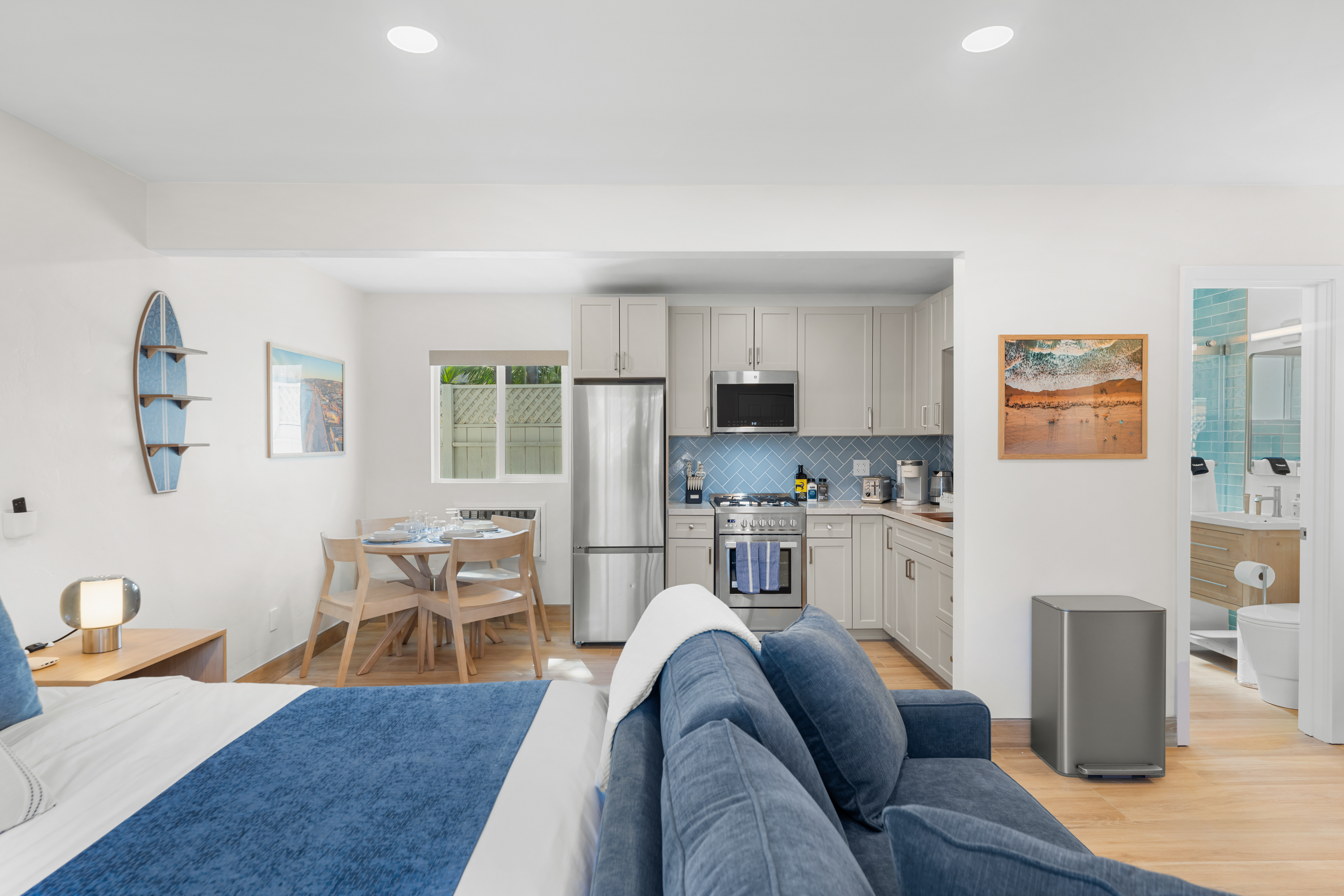 Welcome to the entire two-story building at 1244 Oliver Ave — a completely remodeled, light-filled multi-unit property right in the heart of Pacific Beach. Rent the whole building exclusively and enjoy 9 modern apartments: 8 identical ~400 sq ft studios (5 upstairs, 4 downstairs) and one spacious ~700 sq ft one-bedroom on the first floor, all finished with the same fresh, coastal-inspired design for seamless group accommodations. You’re steps from PB’s best: the beach, boardwalk, surf spots, epic sunsets, coffee shops, taco stands, and that signature relaxed-yet-energetic vibe. Arrival is simple with keyless entry — personal codes arrive the morning of check-in for easy access. Please note: The upstairs studios (5 units) require stairs (no elevator), while the downstairs studios (4 units) and the one-bedroom are fully first-floor with no stairs needed. Each studio offers a bright, open floor plan with large windows pouring in natural light, a luxurious premium king BedGear bed dressed in crisp hotel-quality linens and pillows for deep rest, a full-size queen sofa sleeper (sleeps up to 4 per unit), large nightstands with extension cords for charging, and roll-down blackout shades for complete light control and quiet mornings after PB evenings. The one-bedroom provides extra privacy and space: a separate bedroom with the same premium king BedGear setup as a true retreat (door for quiet rest), his-and-hers built-out closets for ample, organized storage of clothes, luggage, and beach gear, plus the open living area with queen sofa sleeper and a proper dining table seating four. Every unit includes a brand-new full kitchen: stainless steel appliances, generous counter space, plenty of storage, a Keurig coffee maker stocked with pods and sugar, cookware, dishes, utensils, and more. The spa-like bathrooms feature a deep tub with sleek sliding glass door, soft-close toilet, hair dryer, and full bathroom essentials. We’ve included the thoughtful details: beach chairs, Pack ’n Play, iron + ironing board, luggage racks, vacuum, basic cleaning supplies, hotel-quality linens, and plush beach towels available property-wide. Parking is a breeze with one dedicated spot per unit (9 total) — rare and valuable in Pacific Beach! Your group has exclusive use of the on-site shared laundry room featuring two high-efficiency stackable washers and dryers — completely complimentary, including detergent and dryer sheets (great for sandy beach days or travel laundry). Pet-friendly and family-friendly, this fresh, modern building feels like your private PB retreat — perfect for groups seeking individual units with shared ease. Spread out, relax in your own space, gather as needed, and fully enjoy Pacific Beach. Your perfect group headquarters awaits — come create lasting memories! STR-13359L STR-13328L STR-13361L STR-13374L STR-13269L STR-13352L STR-13351L STR-13340L STR-13329L TOT: 65992
